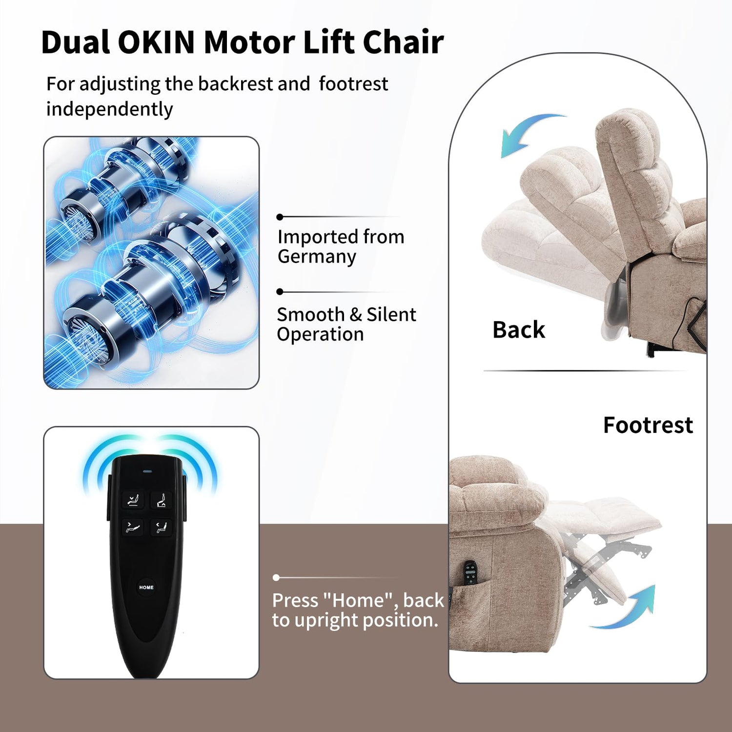 - Vibration Massage & Lumbar Heating: EZZUP's dual motor lift chair has 8 vibration nodes on the back, waist, thighs, and legs. There are 3 massage modes and 3 intensities to meet your different needs. The 15/30/60 minute timer function allows you to easily set massage and heating times. Vibration massage can relax your tired body and promote blood circulation throughout the body!