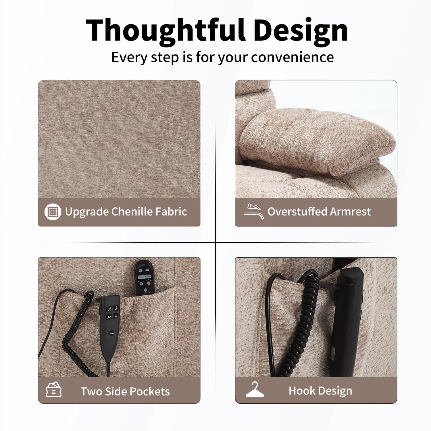 EZZUP Lay Flat Recliner with Vibration Massage and Lumbar Heating, 26'' Wide Recliner Chair with Infinite Position and 2 Remote Controls, Soft Chenille Lift Recliner for Living Room, Khaki