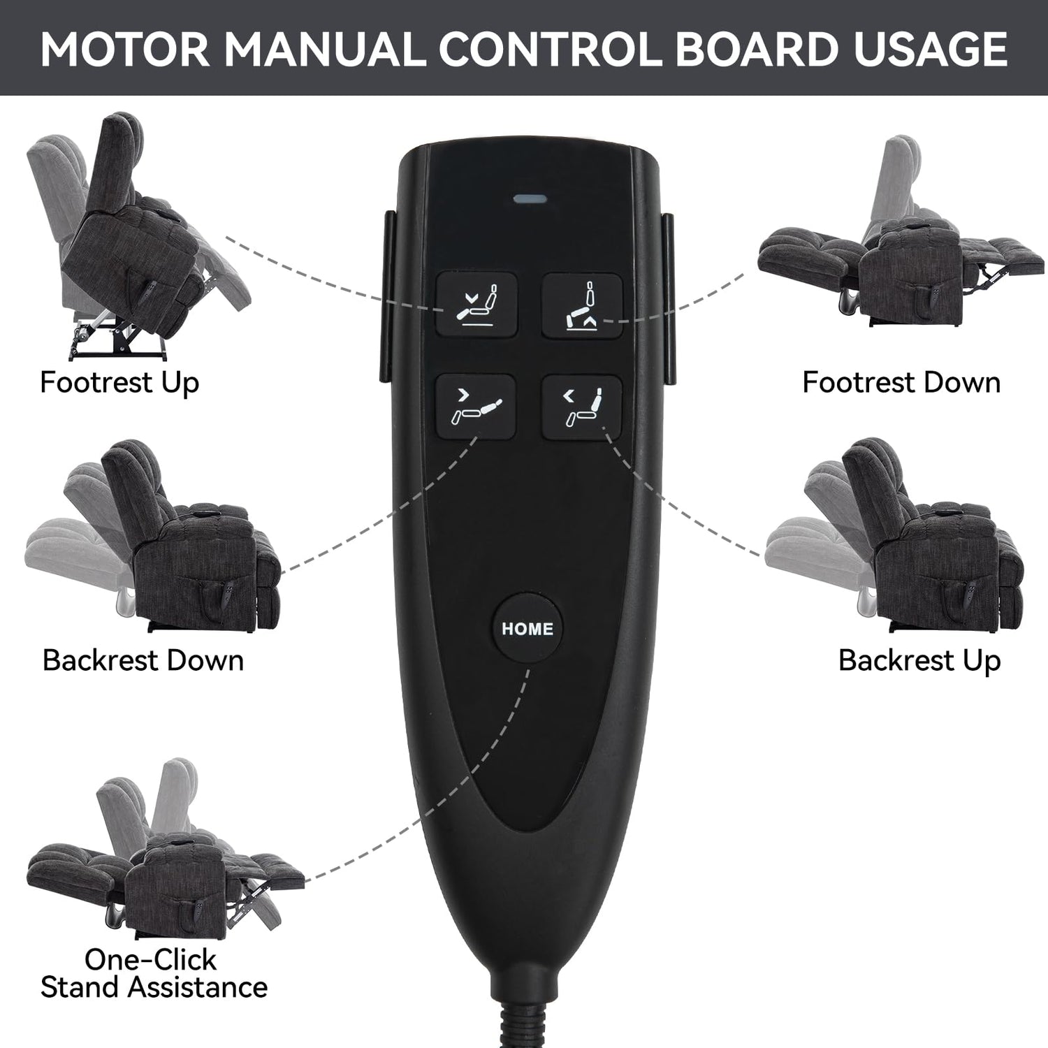 - Home Button: You only need to press the HOME button on the remote control to directly return to the upright position. When the inclined position is raised, the back will move first to ensure your safety.