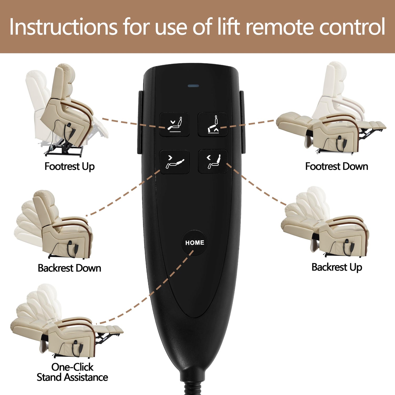- [Heavy-Duty Standing Aid] Engineered with a robust lift mechanism, this chair gently elevates to assist seniors in standing without knee or back strain. A single press of the 'HOME' button returns it to upright. Ideal for elderly users, post-surgery recovery, and limited-mobility individuals.