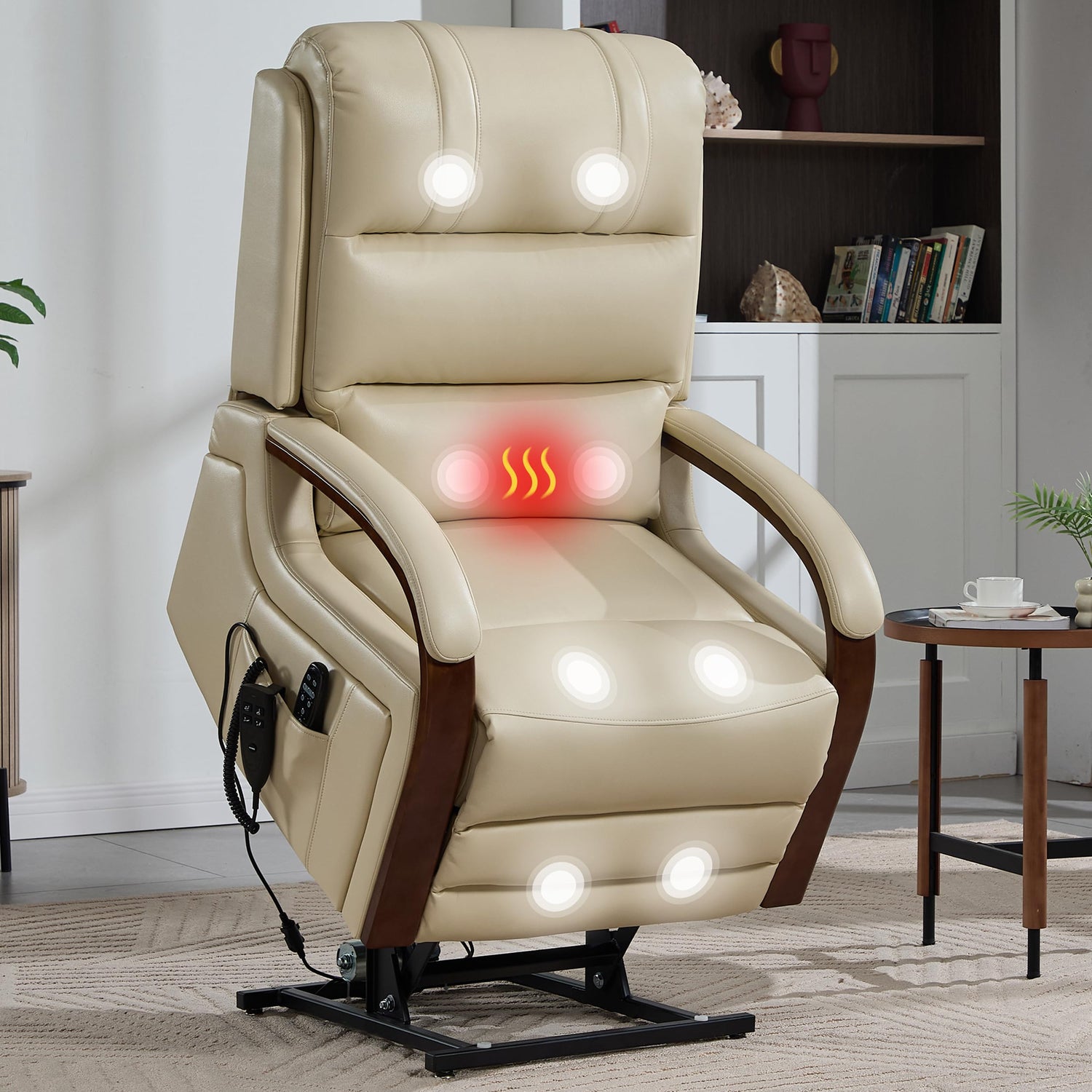 EZZUP Power Lift Recliner Chair for Elderly People, Dual Motor Lift Chair with Vibration Massage and Heat, Lay Flat Recliner with Solid Wood Armrest, Standing Assistance Reclining, Faux Leather Beige