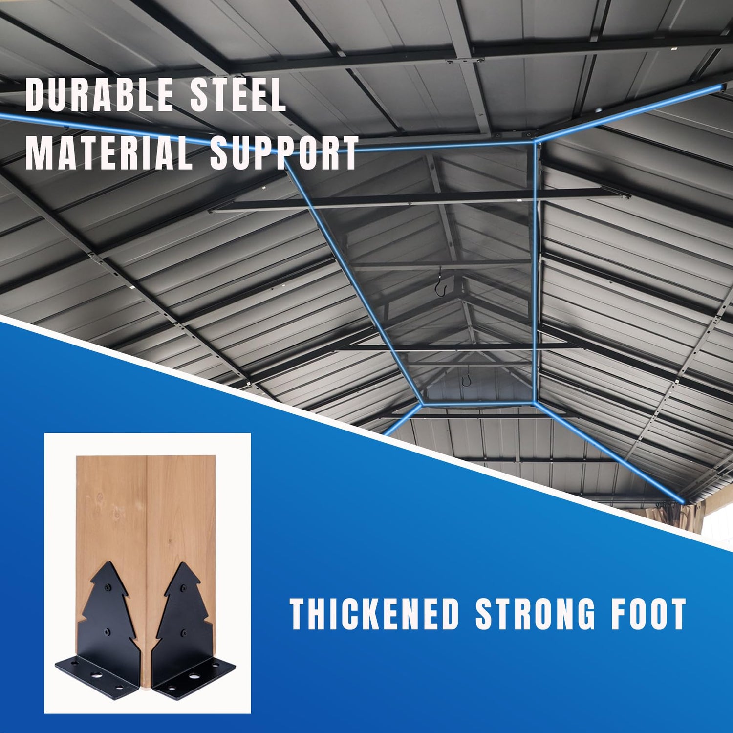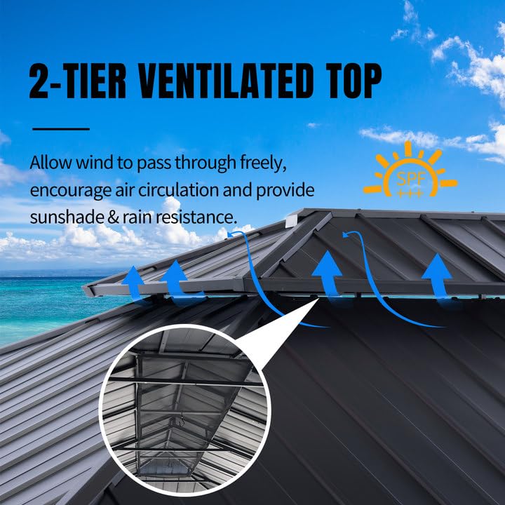 - 【Sloped Galvanized Double Roof】Our wood gazebo roof is made of thick galvanized steel sheet, the load-bearing capacity up to 5000 lbs. This galvanized technology not only can prevent fading, rust-resistant and prolongs service life, but also avoid seepage. Smoothly slope design and multiple steel sheet vertical stripes can relieve rain and snow accumulation. Double tier roof provided air ventilation, reduce the heat and strong wind pressure.