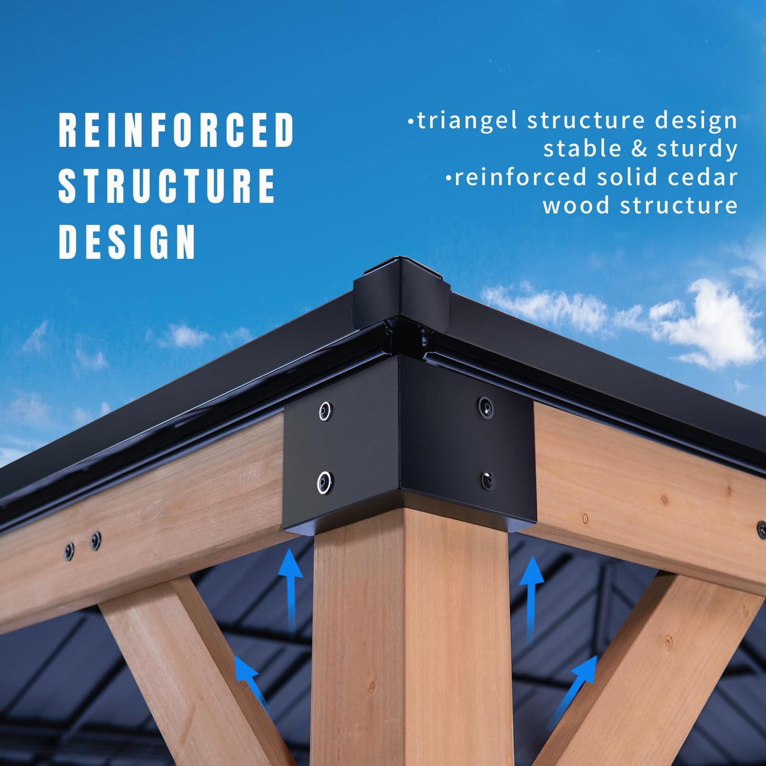 - 【Nature Wood Frame & Reinforced Structural Design】This hardtop gazebo frame made from premium spruce cedar wood and coated special handling. It not only retain original wood texture but also last durability. Each gazebo wood posts with triangle structure design to enhance stable in bad weather.