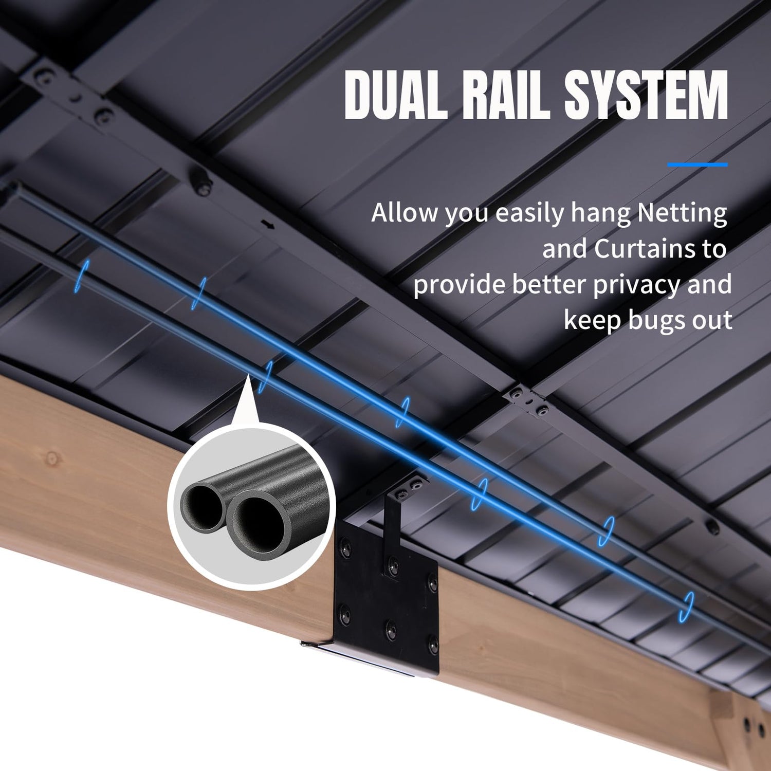 - 【Netting & Curtains Dual Rail System】This outdoor metal top gazebo feaure a built dual rail system, allow the netting and curtains to be hangle separately or in the meantime. Comes with the removable double zippered netting and curtains, each panel of curtain is coated with thicklayer which protect you from direct sunlight. Not only keeps you away from flying insects but also provide better privacy.