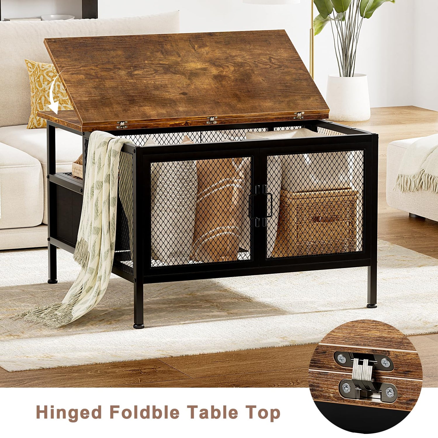 FABATO Flip Top Coffee Table, Square Coffee Tables Metal Wood, Farmhouse Lift Up Coffee Table Cocktail Table with Wire Mesh Barn Door and Storage, Steel Frame, Small Tea Table for Living Room, Black