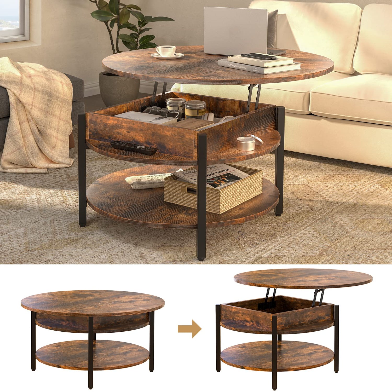- 【Lifting Round Coffee Table】Adjustable lift top coffee table can be easily lifted. Upgrade over the regular round coffee table, the FABATO coffee table is equipped with a lift-up top for flexible use. The round table creates a sense of intimacy in your home and adds warmth and emotion when your family sits around it to watch TV or work.
