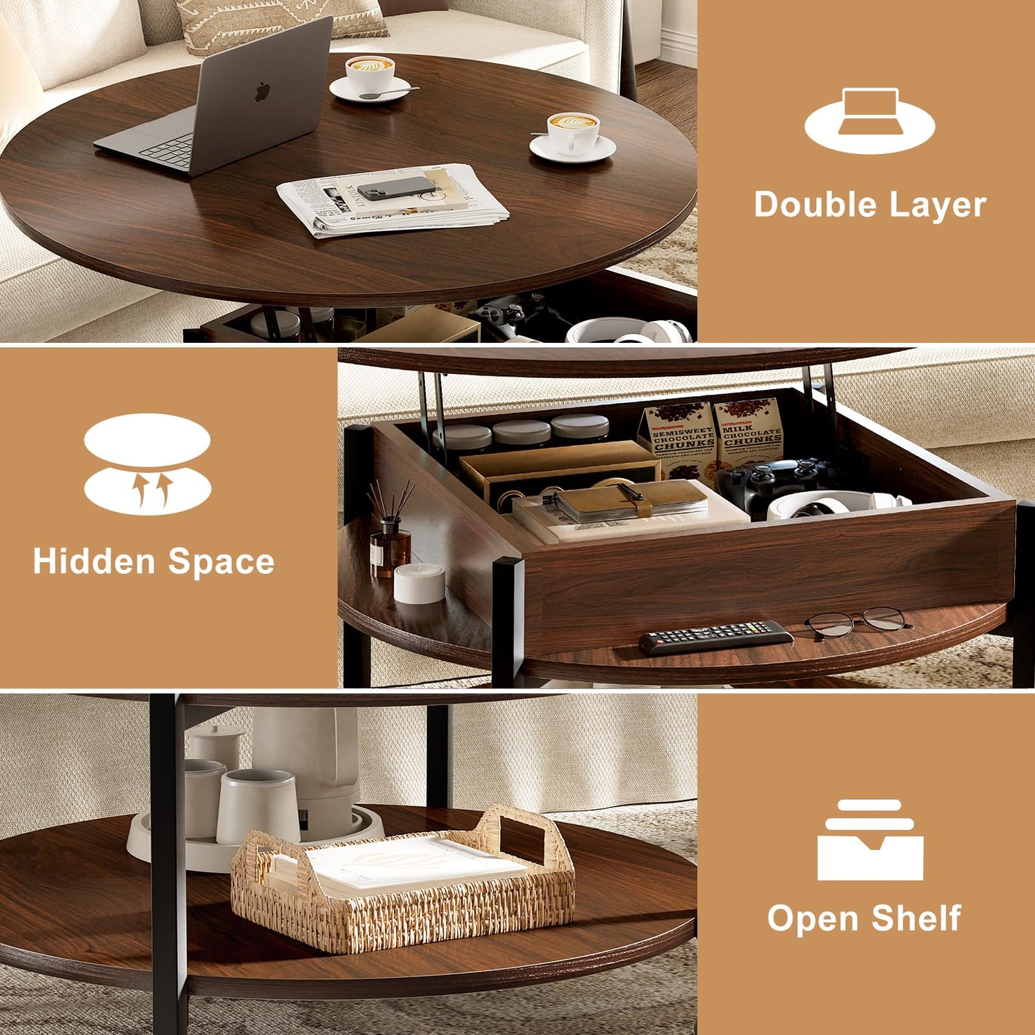 - Lifting Round Coffee Table: Elevating lift top coffee table can be easily lifted. Upgrade over the regular round coffee table, the FABATO coffee pop out table is equipped with a lift-up top for flexible use. The round wood table creates a sense of intimacy in your home and adds warmth and emotion when your family sits around it to watch TV or work