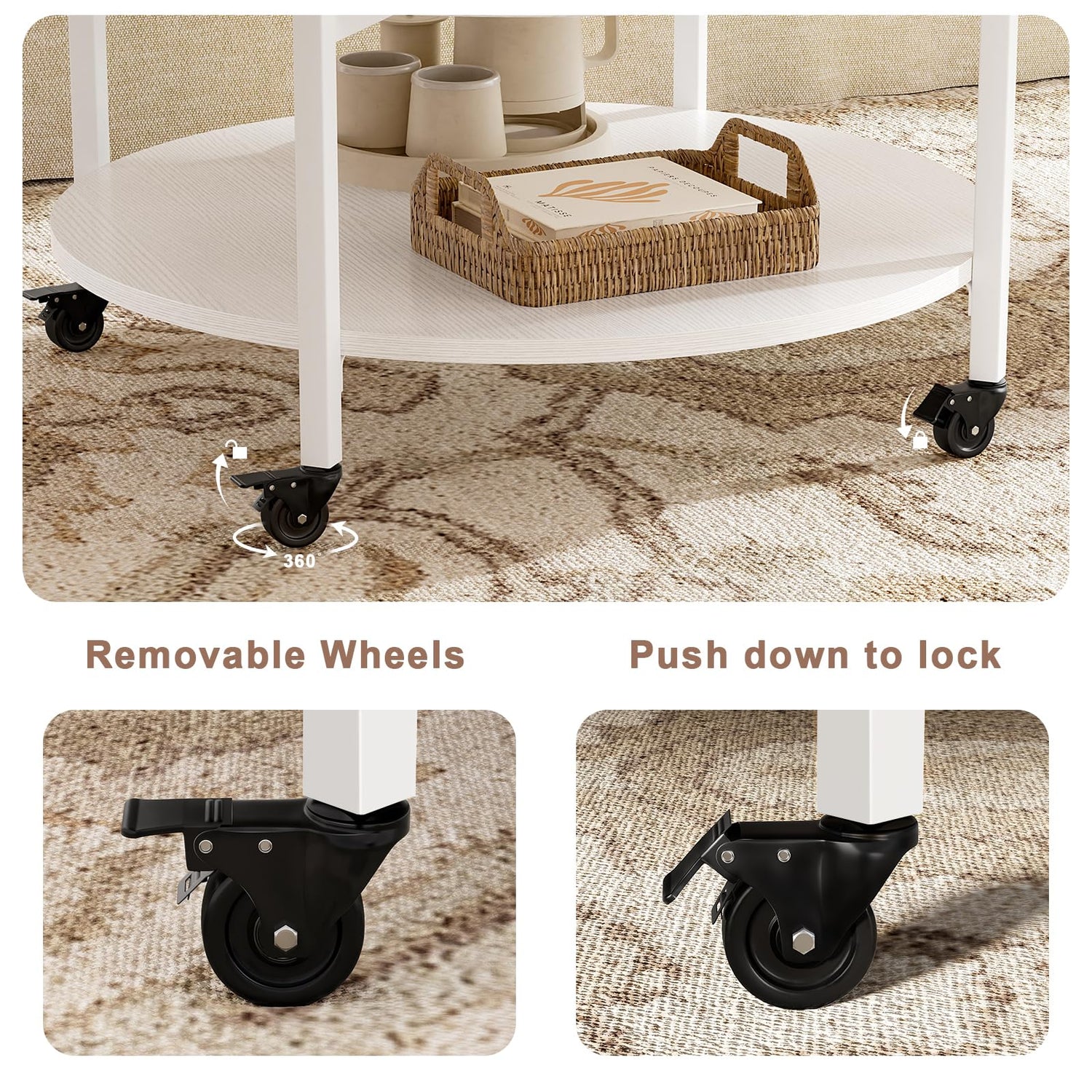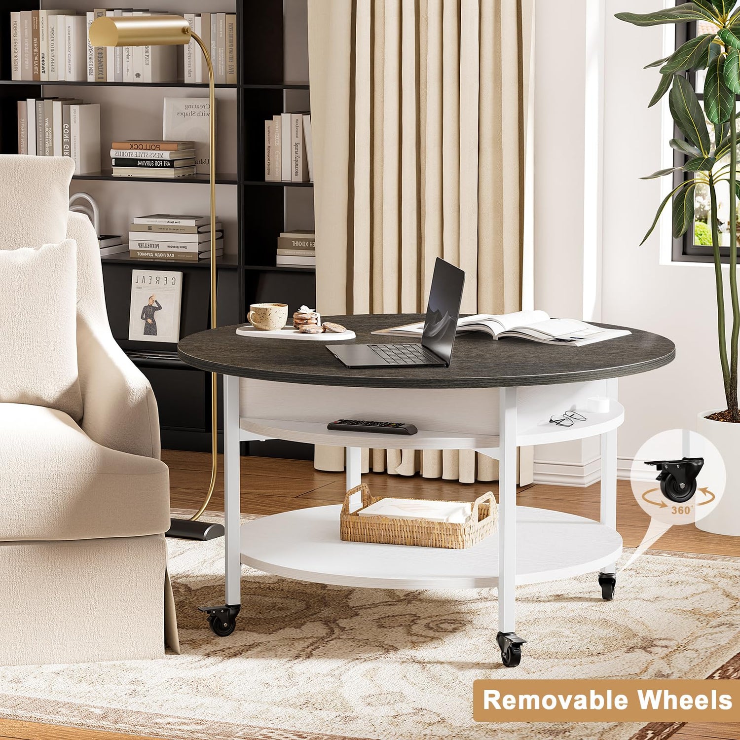 - Wheel Design: Say goodbye to worries about moving or stability issues with this coffee table. This movable round coffee table offers the choice between smooth-rolling lockable wheels for easy mobility for height and stability. Adapt to any environment effortlessly, whether you need to move your table around or ensure it stays firmly in place