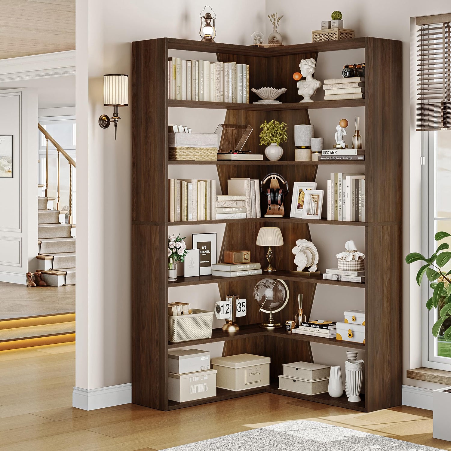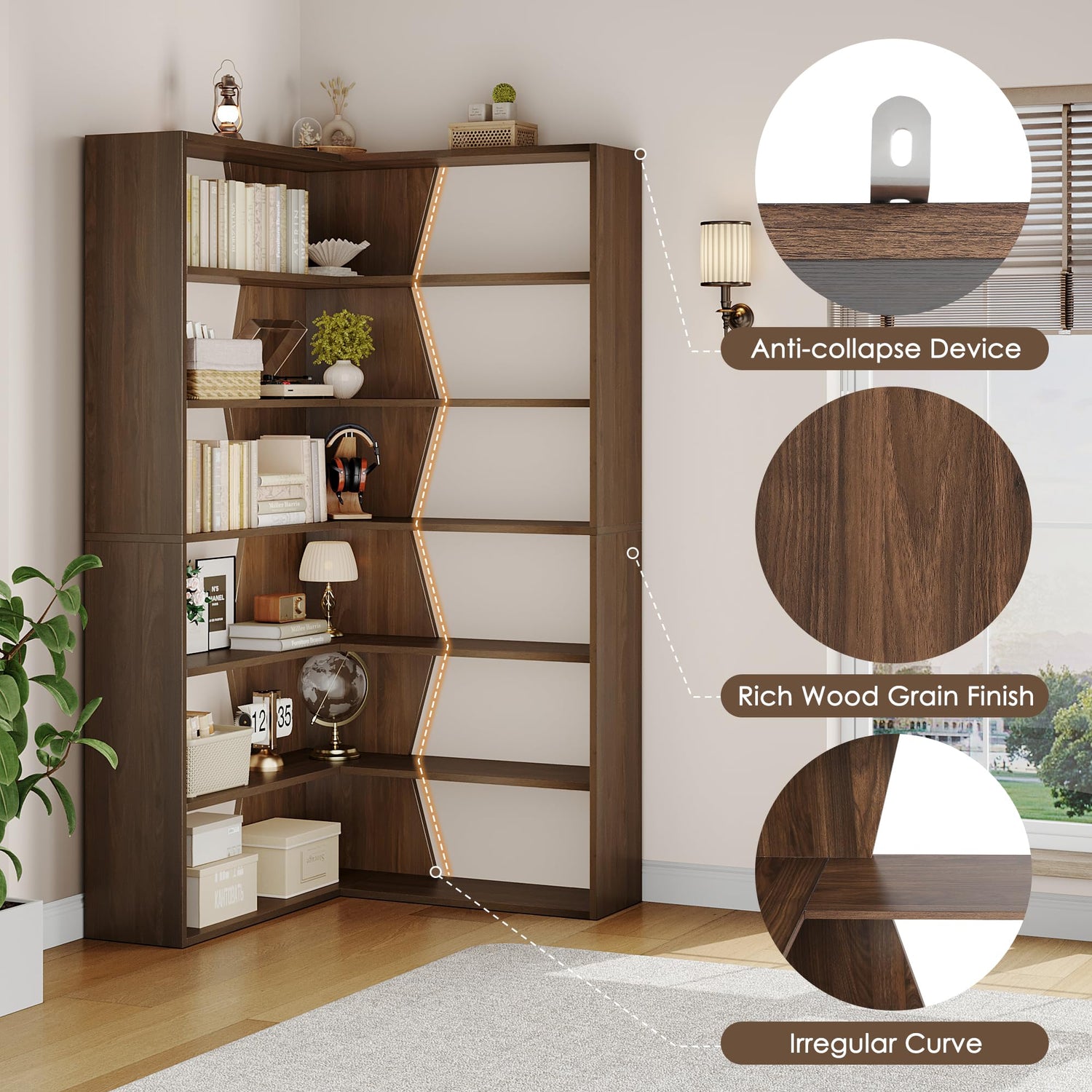 FACBOTALL 6-Tier Corner Bookshelf, Modern Bookshelf and Bookcase, Tall Bookcase Open Display Storage, L Shaped Corner Shelf for Library, Living Room, Home Office, Rustic Brown