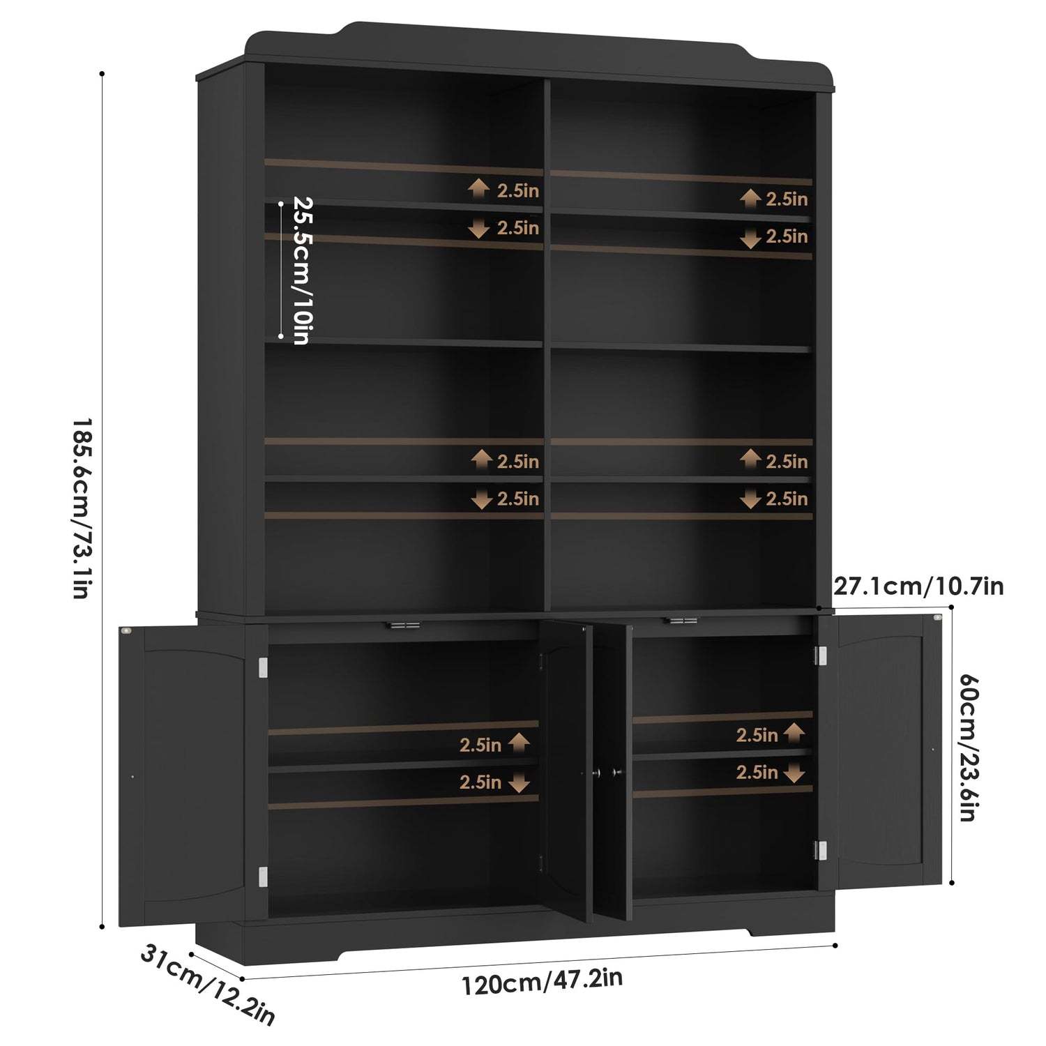 - 6-Tier Bookcase: With the size of two ordinary bookcases, you can get super big storage space. Four doors provide hidden space to keep your home tidy.