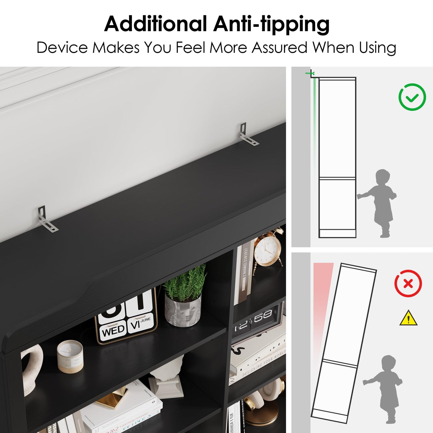- Stylish Top Design: The convex shape at the black bookshelf top enhances the visual appeal of the bookshelf but also adds a touch of elegance to the overall look.