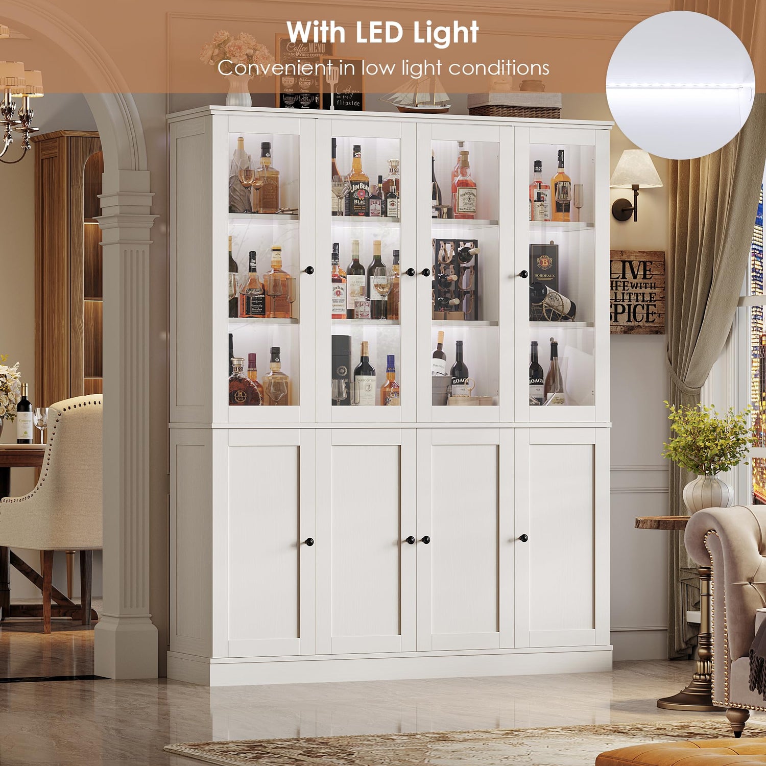 FACBOTALL 74'' Kitchen Pantry Cabinet, 63'' Wide Large Kitchen Hutch Storage Cabinet with LED, Tall Pantry with Adjustable Shelves, Display Cabinets with Glass Door for Living Room, Home Office, White