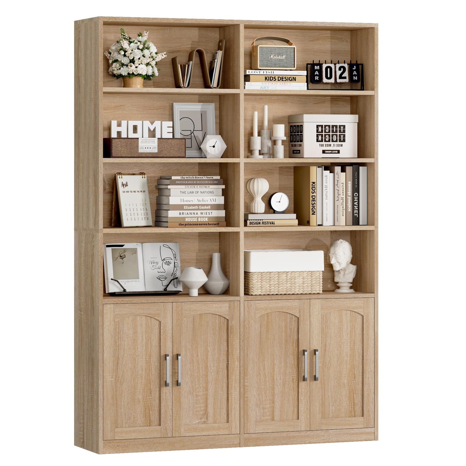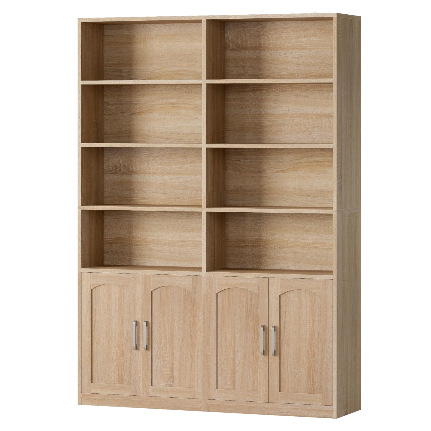 - Modern Open Bookcases - The vertical shelving structure offers a flexible storage and display solution, while the silver handles and arched-shaped doors add a touch of style to your home. Both utility and beauty