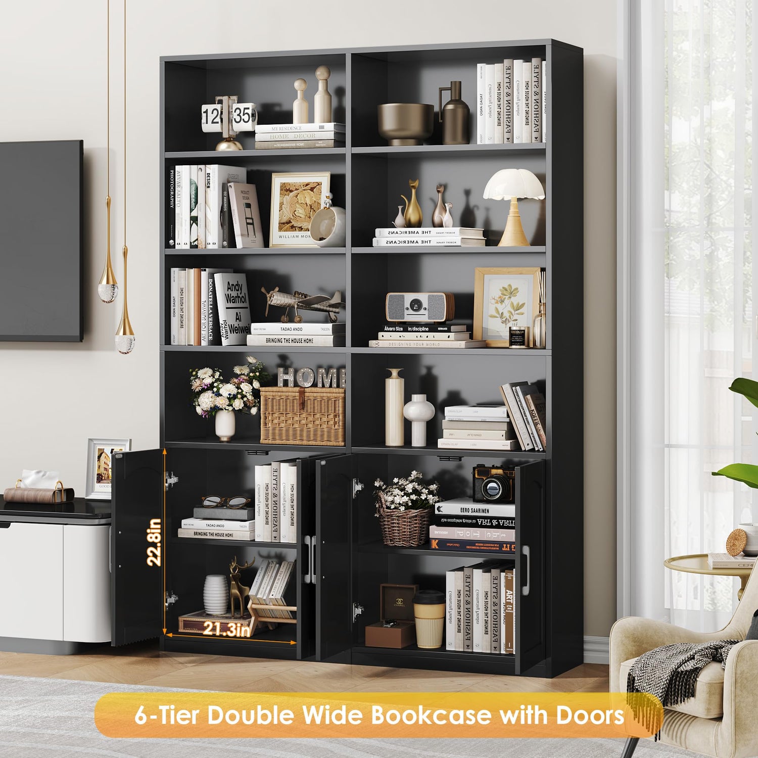 FACBOTALL Bookshelf and Bookcase with Doors, 6 Tier Double Wide Large Bookshelves, Open Display Shelves, 73'' Tall Bookshelf with Storage Cabinets for Home Office, Living Room, Library, Black