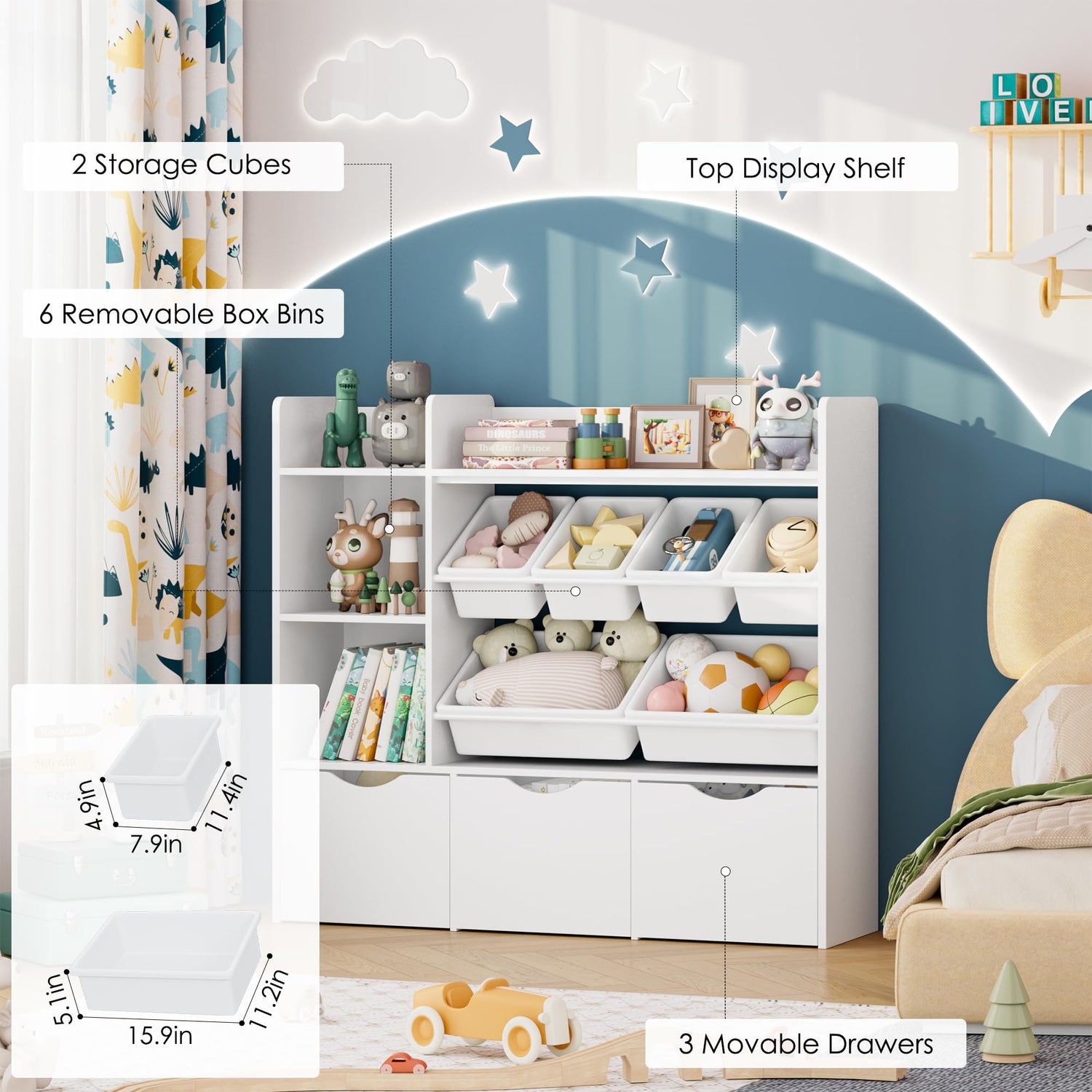 FACBOTALL Toy Storage Organizer with 3 Movable Drawers, Kids Bookshelf with 6 Plastic Bins & 2 Storage Cubbies, Toy Chest with Hidden Wheels, Toy Storage Box for Playroom, Classroom, Kids Room, White