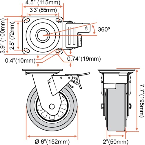 - CASTER SIZE: Overall Height: 7.7" (195mm). Plate Size: 4.5" (115mm) x 3.9" (100mm), Hole center to hole center: 3.3" (85mm) x 2.8" (72mm), Mounting hole dimensions: 0.74" (19mm) x 0.4" (10mm).