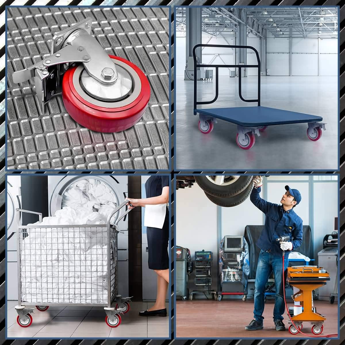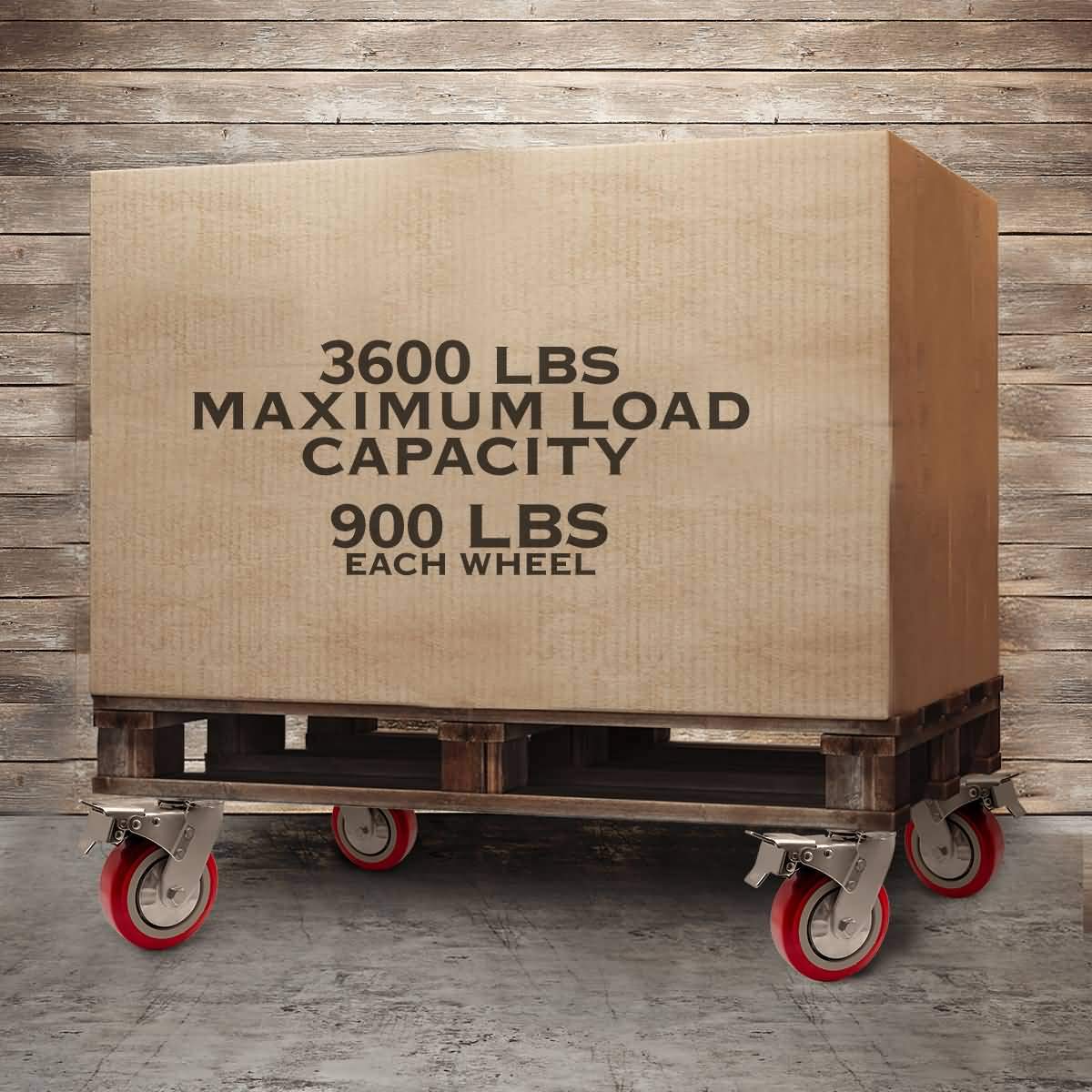 - DUAL LOCKING BRAKE: The total locking brake locks both the caster wheel and the swivel. Rotate 360 degrees. Swivel caster wheels. Capacity: 900lbs each caster wheel. Swivel casters rotate 360 degrees which makes turning the mating equipment possible. It’s good for transporting furnitures and displays quietly and safely.