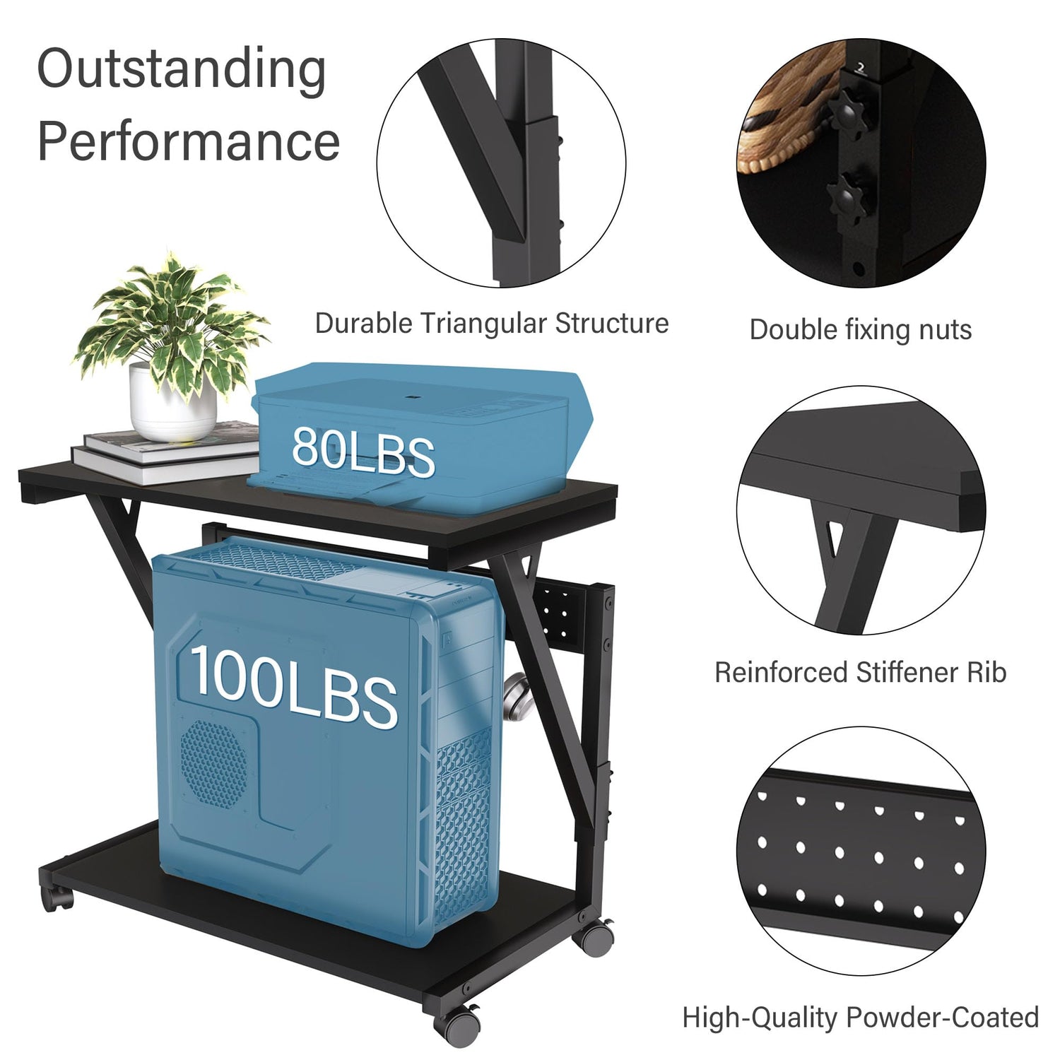 - ๐๐จ๐๐ข๐ฅ๐ข๐ญ๐ฒ ๐๐ง๐ ๐๐ญ๐๐๐ข๐ฅ๐ข๐ญ๐ฒ: The rolling cart equipped with four 360-degree rotating wheels with brakes, the computer tower stand ensures smooth movement on different surfaces while providing stability, even when fully loaded. The design reduces carpet prints, indentations, and makes it easy to clean the floor.