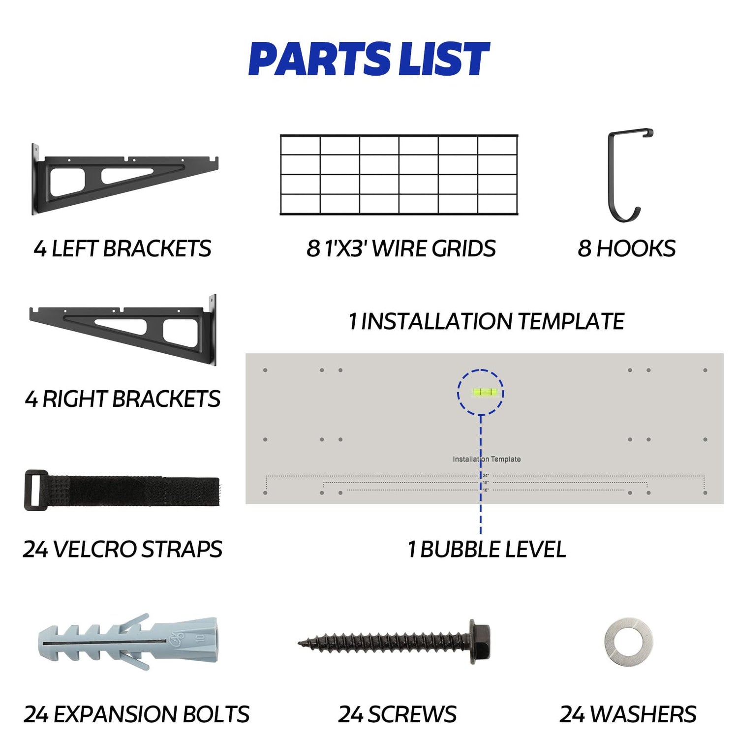 - Multiple Installation Options: This garage wall storage rack consists of 8 1x3ft grid panels and also comes with 8 hooks, so you can choose different installation methods, such as parallel installation, vertical installation and separation installation.