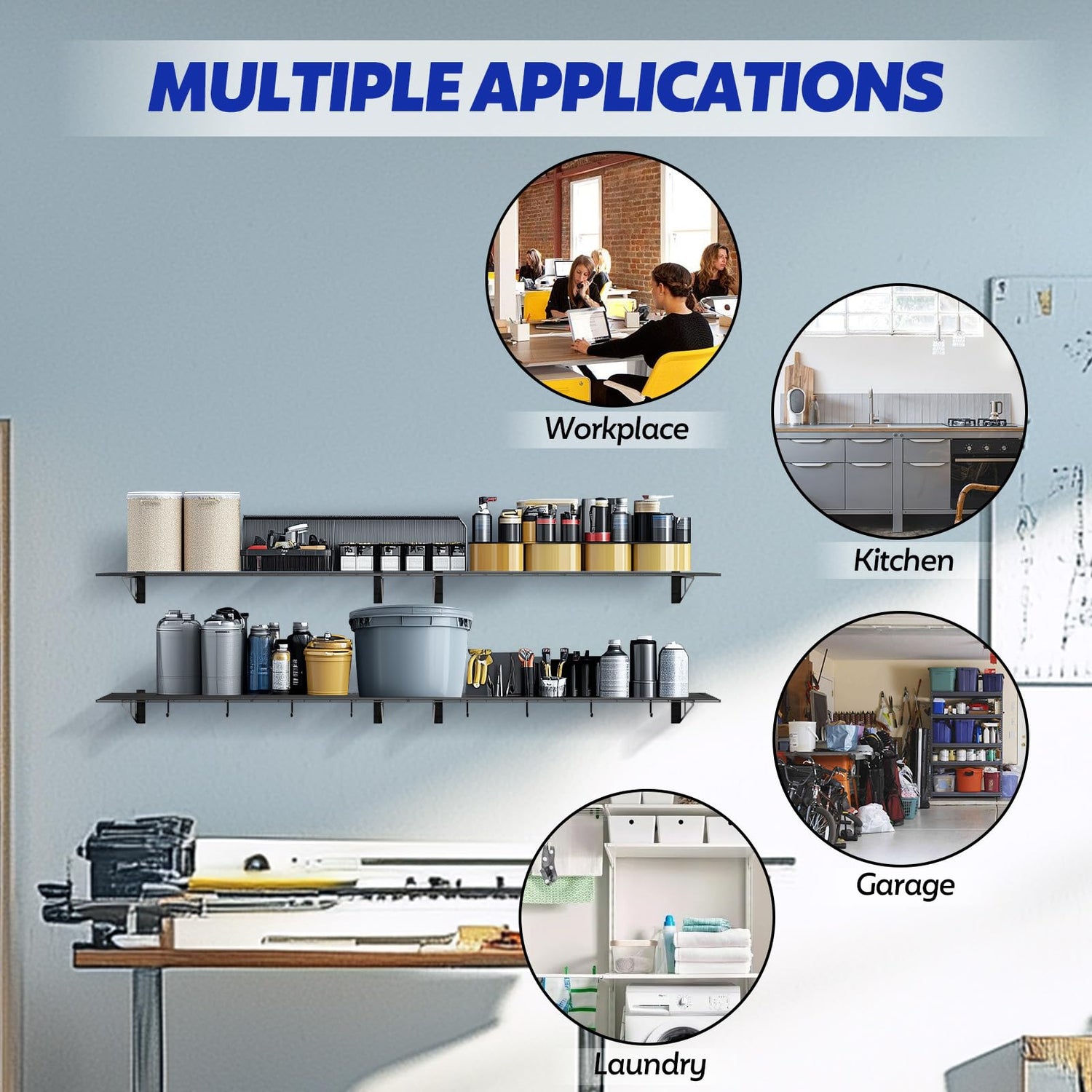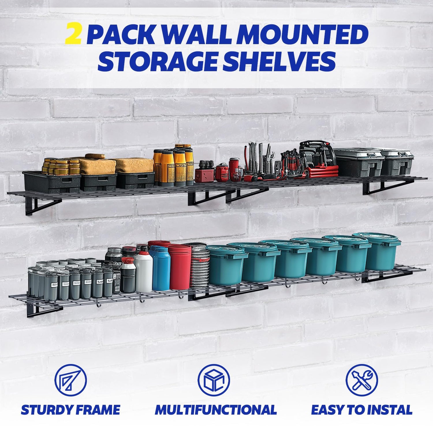 FAHKNS 2 x 6 ft Garage Wall Shelving, 2-Pack Garage Shelving Wall Mounted, 1200LBS Capacity Heavy Duty Metal Wire Shelves, Floating Long Shelf for Carport Shed Kitchen, Black