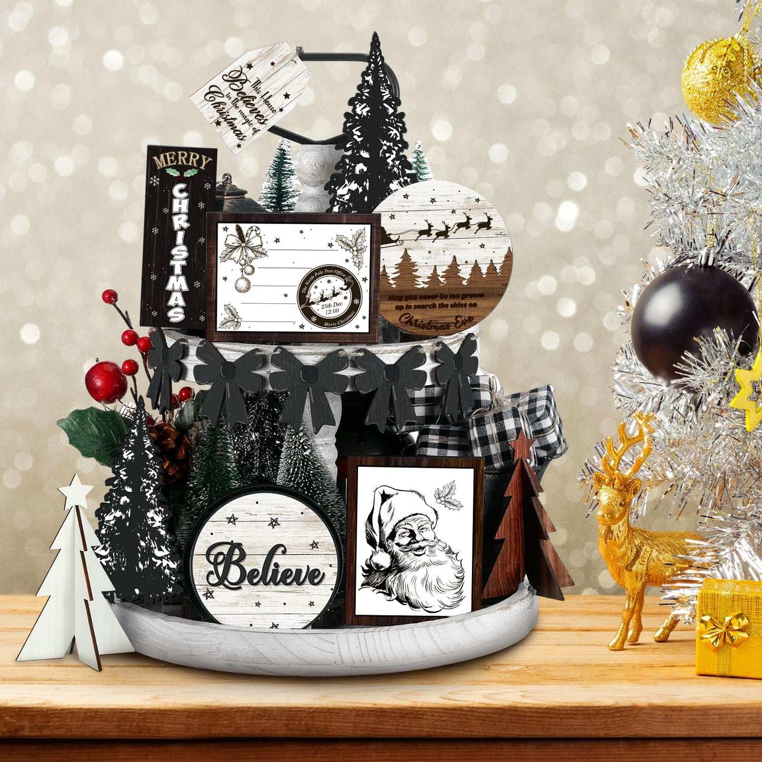 FairySandy Christmas Tiered Tray Decor Wooden Sign Farmhouse Tier Tray Decorations for Home Xmas Winter Party Bathroom Kitchen Bedroom (Stylish Style, 15 Pcs)