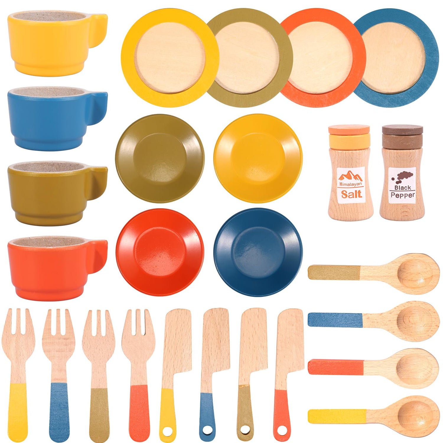 FALESOUL 26Pcs Wooden Toy Kitchen Dish Set, Toddler Plates and Cutlery Set Toy with Plates Cups Spoons, Toy Kitchen Accessories Kids Role Play Gift for Age 3+ Years