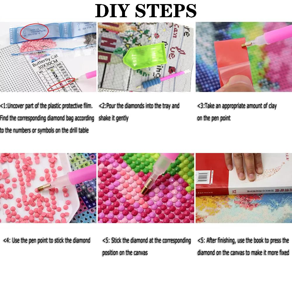 - Contain All Diamond Art Tools: Our paint kits contain all tools, include 1pc Point diamond pen, 1pc 11.8x11.8in canvas, 1pc glue, 1pc tray, 10pcs ziplock bags and enough colorful round diamonds (offer extra 30% diamond dots beads), so you don’t need to purchase any additional tools.