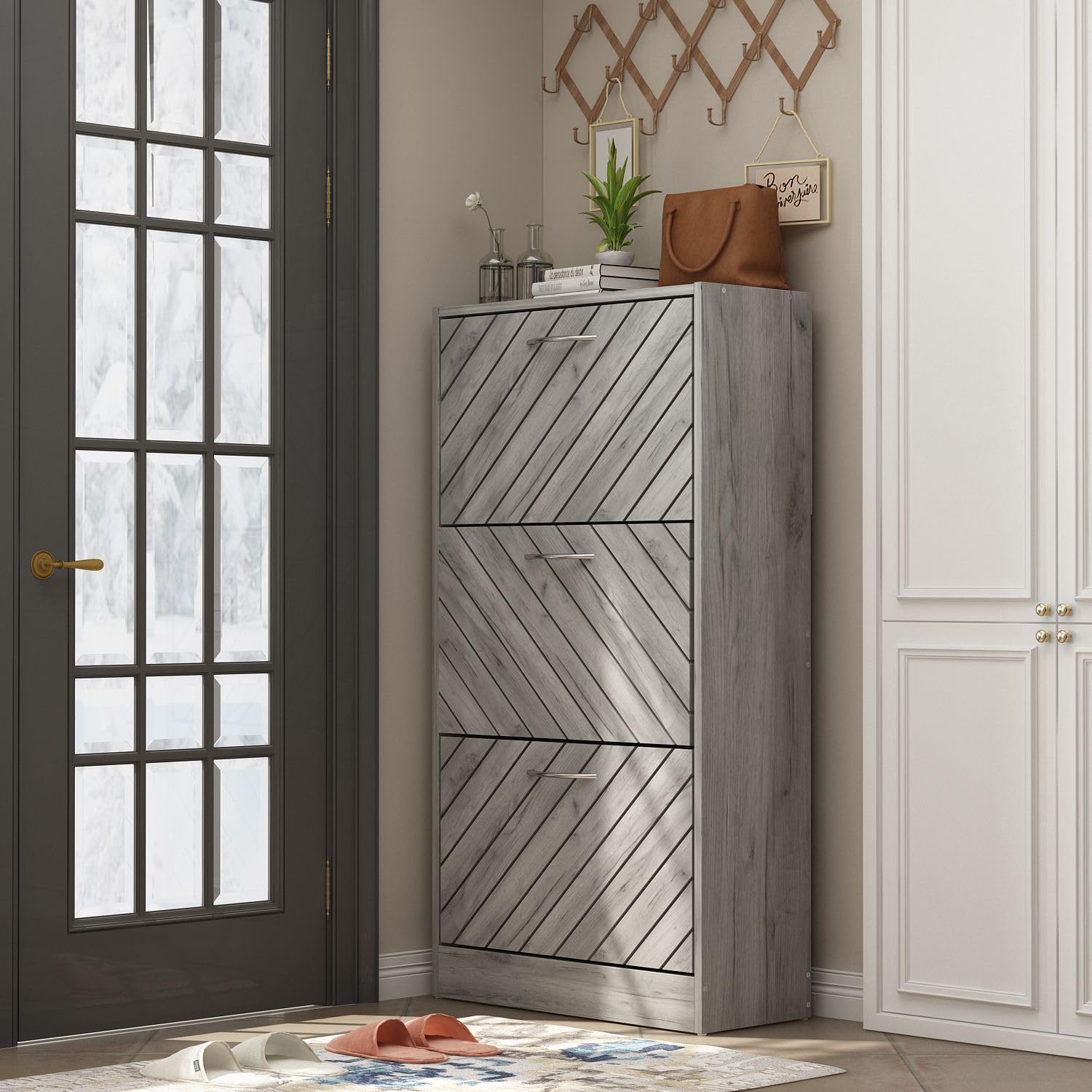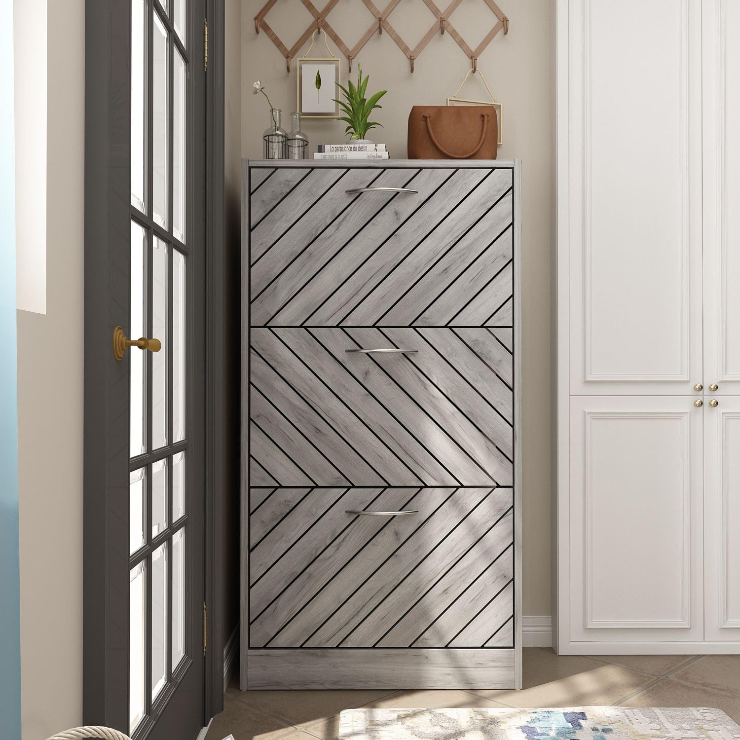 FAMAPY Modern Shoe Cabinet with 3 Flip Drawers, Freestanding Shoe Storage Cabinet, Slanted Design, Shoe Storage Organizer for Hallway Entryway Grey (22.4”W x 9.4”D x 42.3”H)