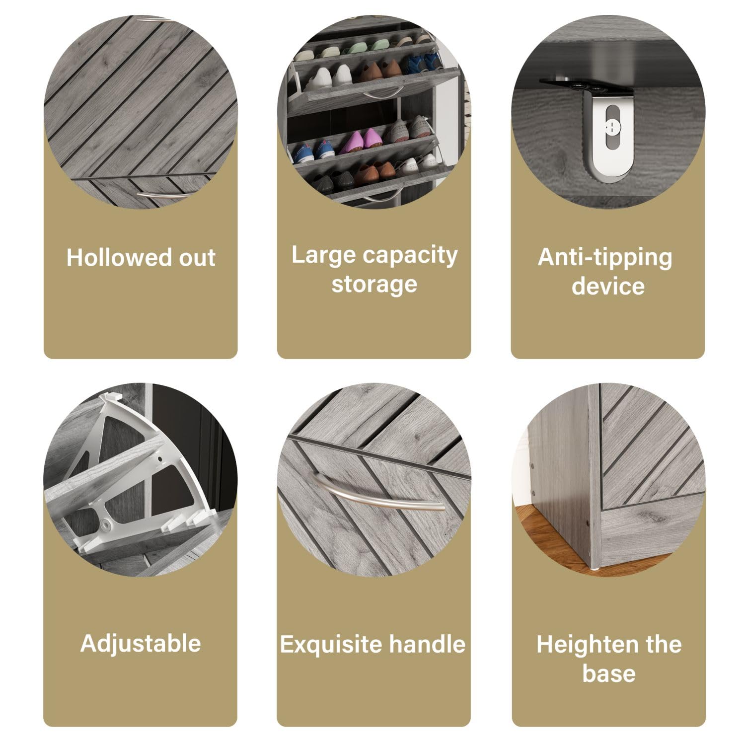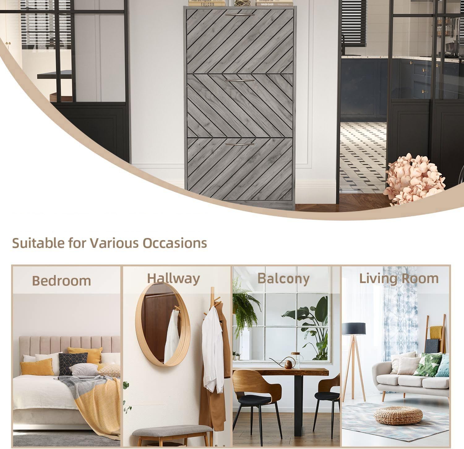 Details: FAMAPY Modern Shoe Cabinet with 3 Flip Drawers, Freestanding Shoe Storage Cabinet, Slanted Design, Shoe Storage Organizer for Hallway Entryway Grey (22.4”W x 9.4”D x 42.3”H)