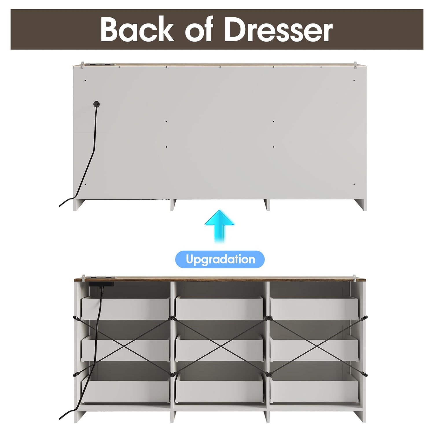 Fameill Dresser for Bedroom, 9 Drawer Wide Dresser Organizer with Charging Station, Tall Dresser for Hallway, Wood Dresser with Metal Handles, Farmhouse White