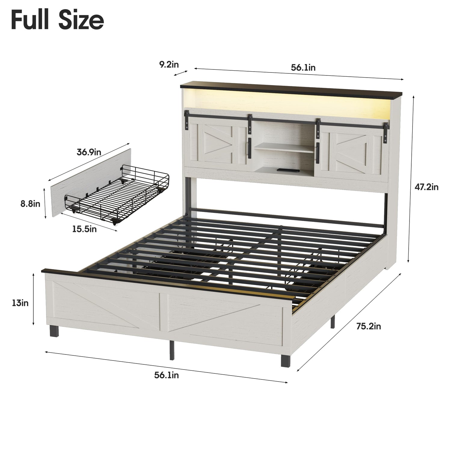 Fameill Farmhouse Full Bed Frame with LED Lights, Charging Station, and 4 Storage Drawers in Antique White