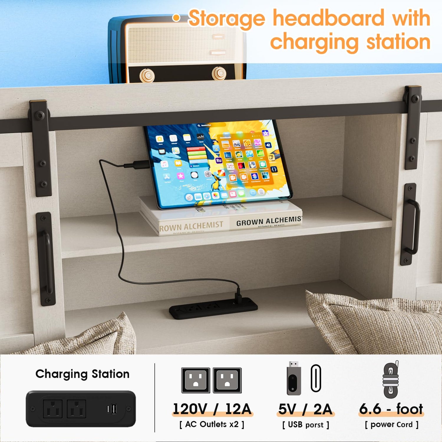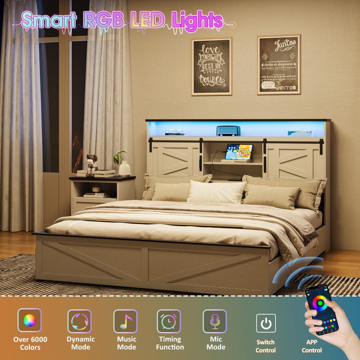 Fameill Farmhouse King Size Bed Frame with 4 Drawers and Bookcase Headboard, Sliding Barn Door Storage Shelves, LED Lights and Charging Station, No Box Spring Needed, Antique White