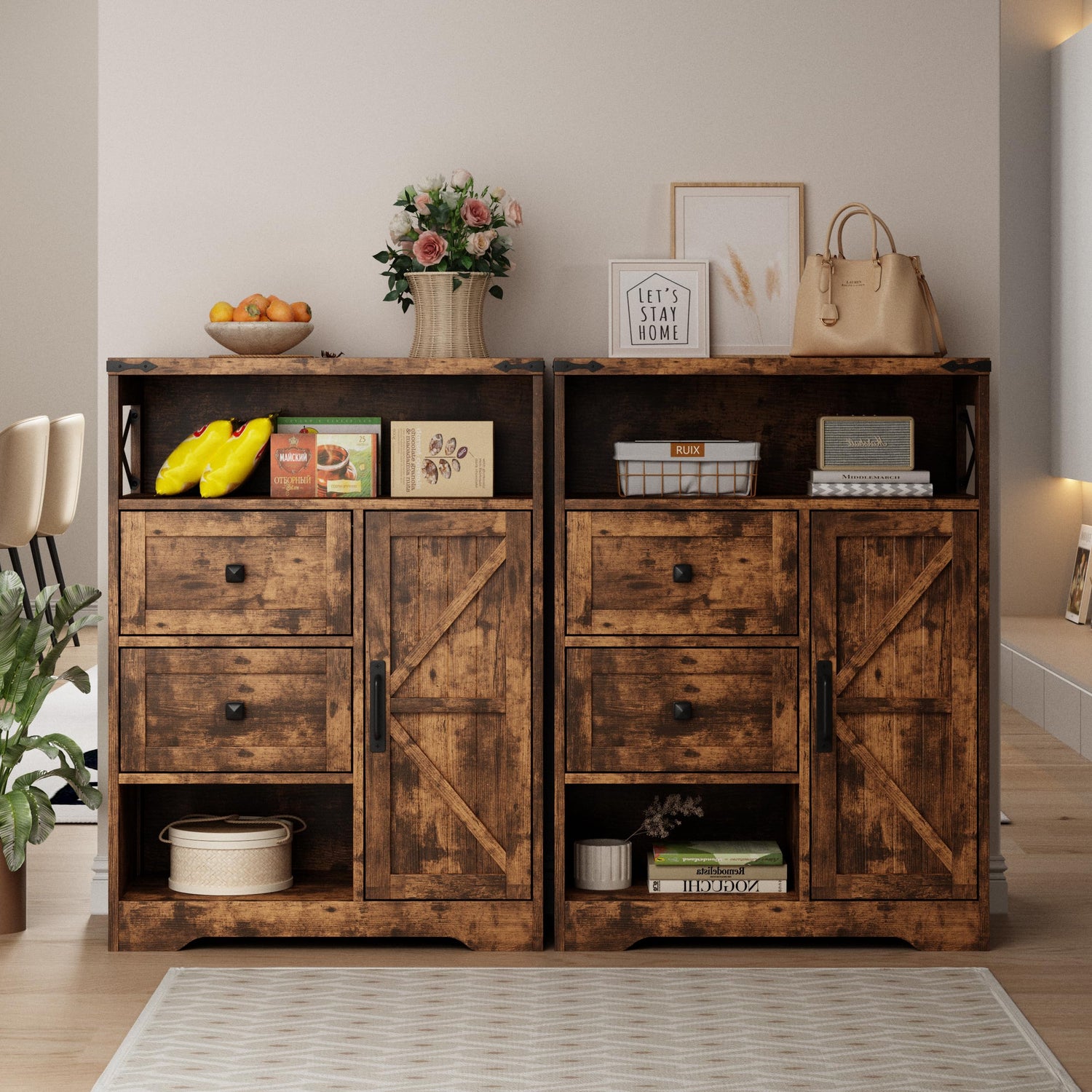 - Farmhouse Style Design:Crafted from high-quality engineered wood, our storage cabinet is designed with classic barn door and 2 Drawers,adding warmth and texture to your home while also serving as a decorative piece to enhance the overall room style.
