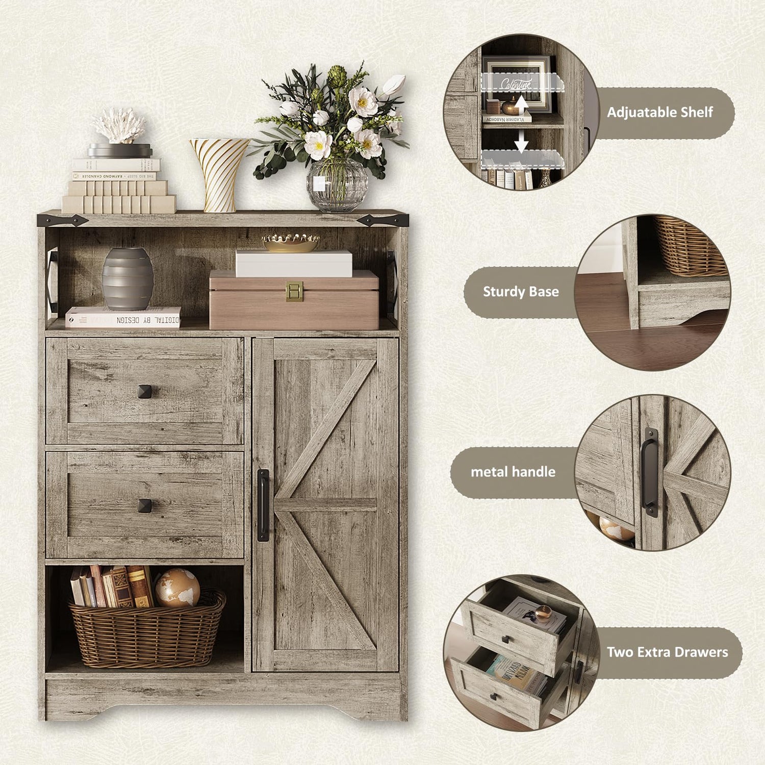 - Farmhouse Style Design:Crafted from high-quality engineered wood, our storage cabinet is designed with classic barn door and 2 Drawers,adding warmth and texture to your home while also serving as a decorative piece to enhance the overall room style.