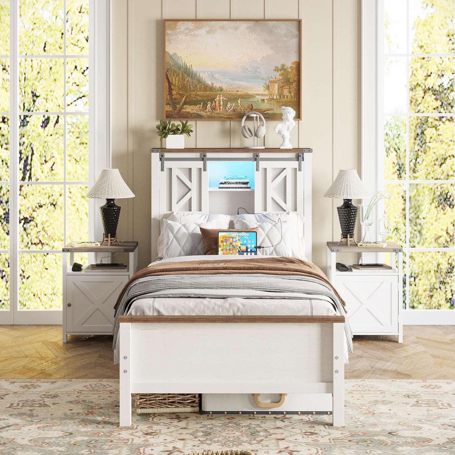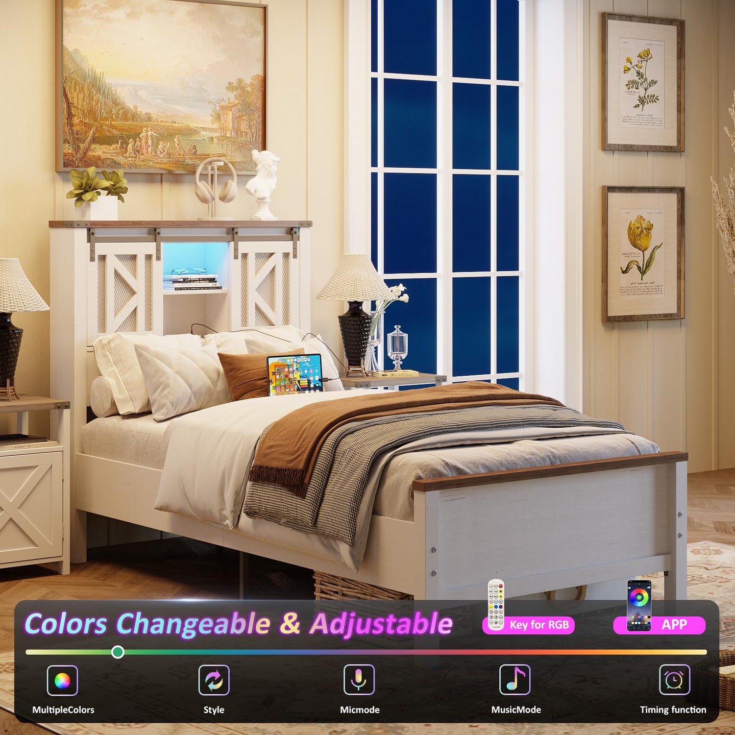 Fameill Farmhouse Twin Size Bed Frame with Storage Headboard, Sliding Barn Door Design, 2-Tier Shelves Bookcase Storage, Charging Ports & USB Outlets, LED Light, No Box Spring Needed, Easy Assembly