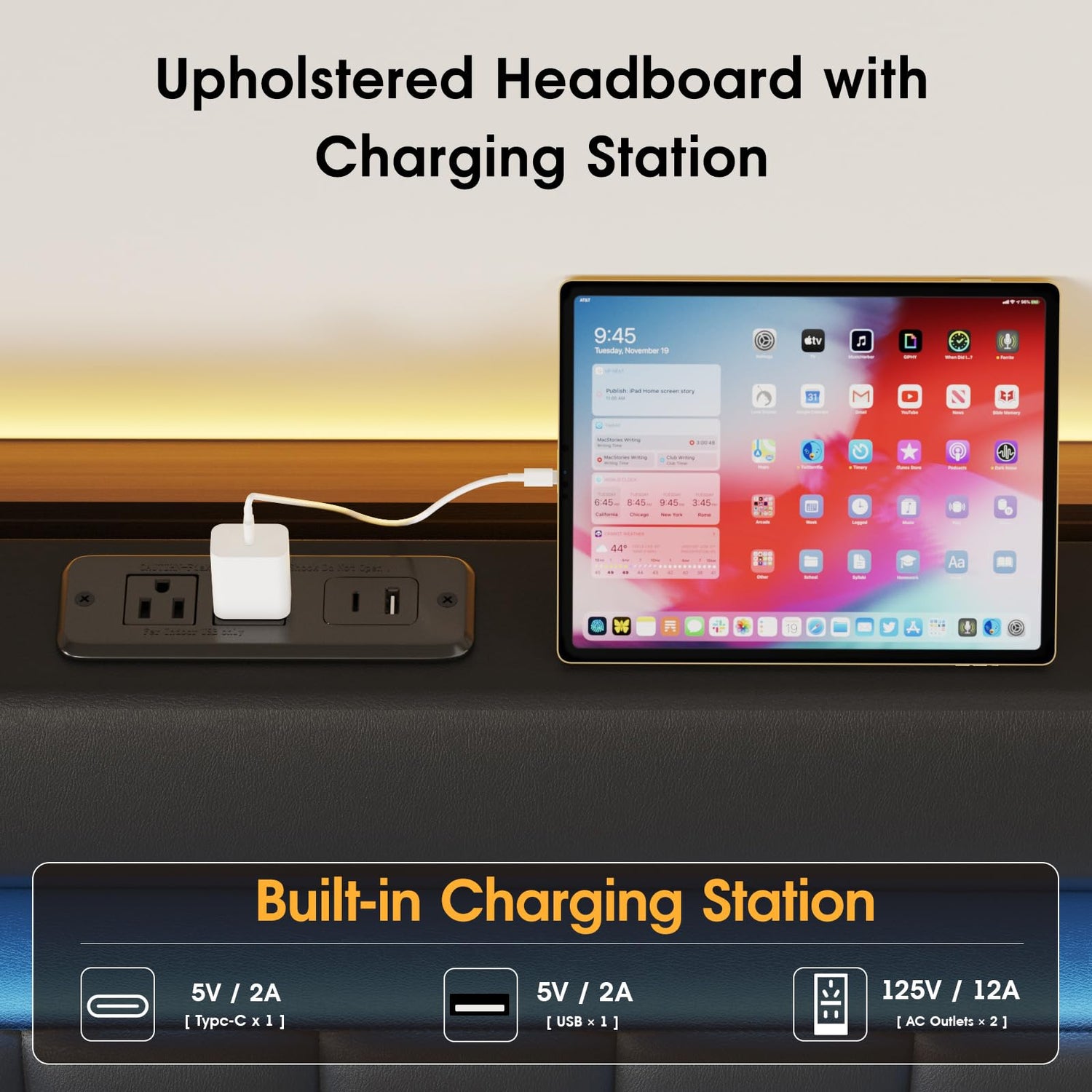 - 【Charging Station Integrated within Headboard】 Elevating convenience, our bed frame incorporates a charging station at the headboard’s apex, featuring 2 AC outlets, a USB port, and a Type-C port. This setup empowers simultaneous charging of up to four devices, liberating you from cable length constraints during sleep. Enjoy uninterrupted reading or gaming sessions on your bed, free from battery anxiety.