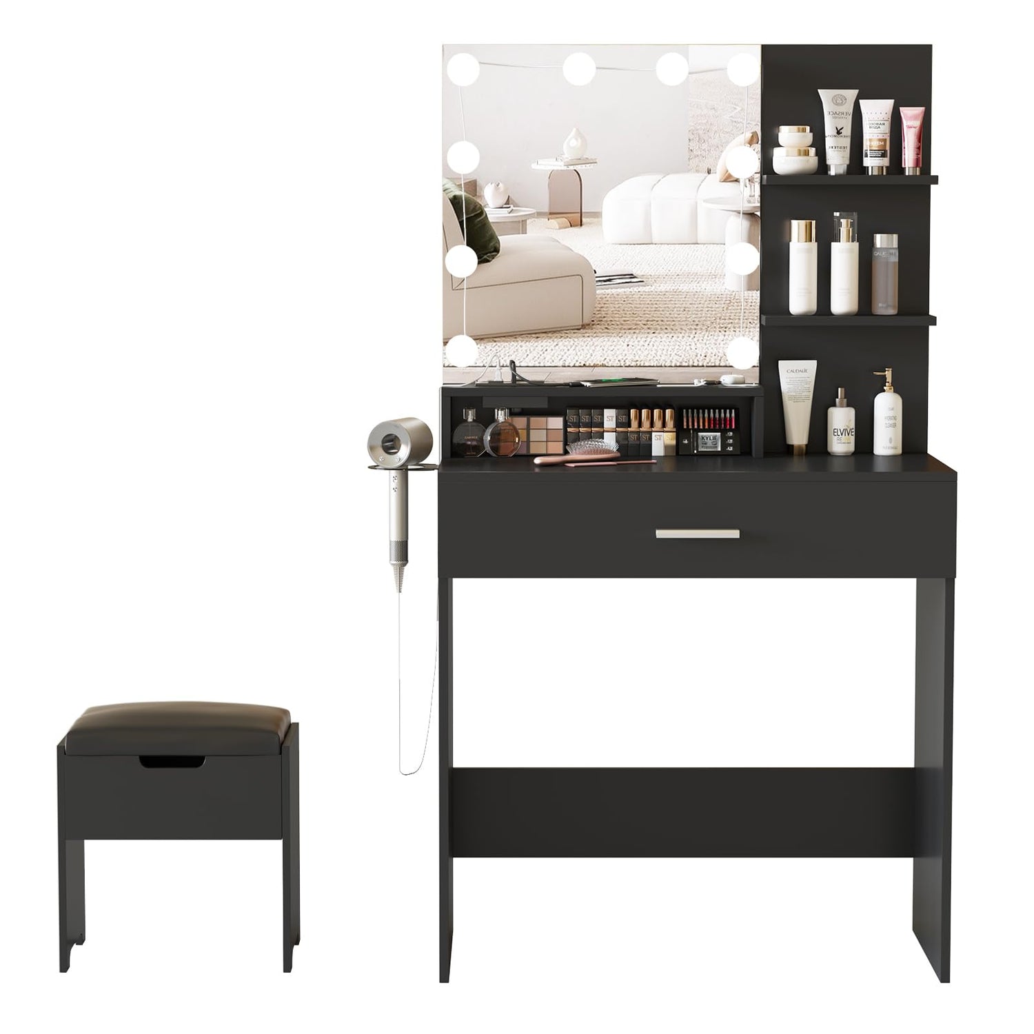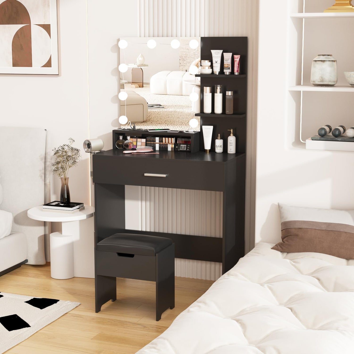 - 【Ample Storage Space】 Large drawers & 3 shelves, open shelves for side storage allow easy access to makeups and keep everything organized. Extra space in the soft cushioned stool for private items, enough storage for all makeups, hair straightener, blow dryer, jewelry, deep and big enough for lotions, make your desktop more tidy and clean.