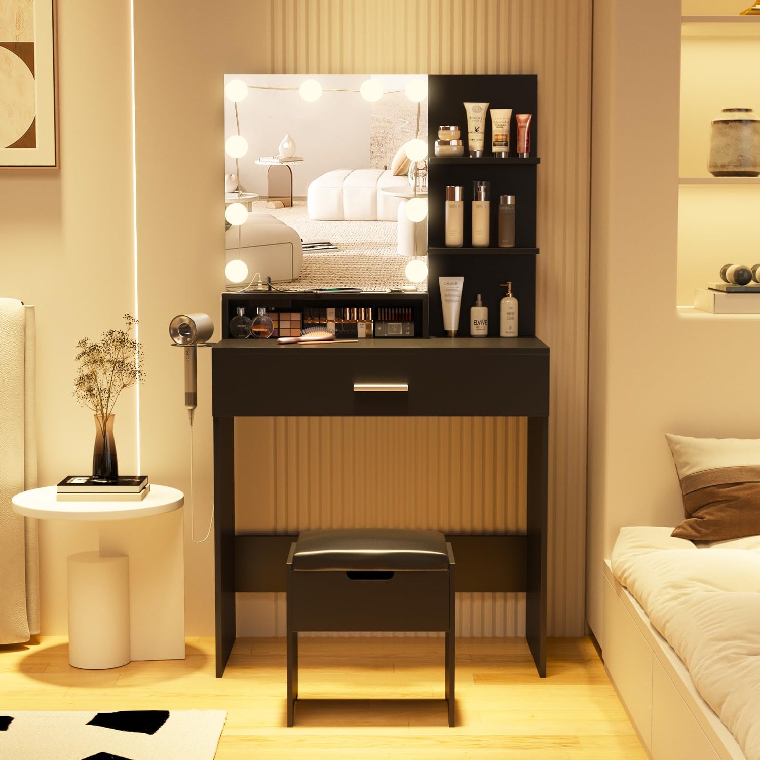 Fameill Makeup Vanity Table with Lighted Mirror & Charging Station, Black Vanity Set Vanity Desk with 3 Lighting Modes, Brightness Adjustable, 31.5in(W)