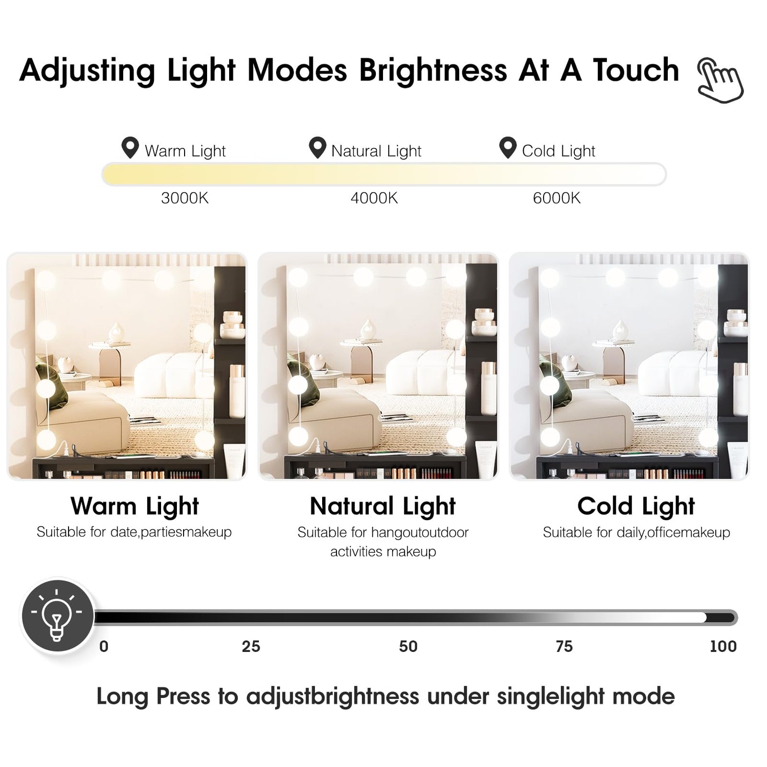 - 【12pcs LED Bulbs】 With 3 color modes: warm yellow, natural light and bright light, this makeup table can meet your different needs, perfect for home make up, salon or live broadcast.