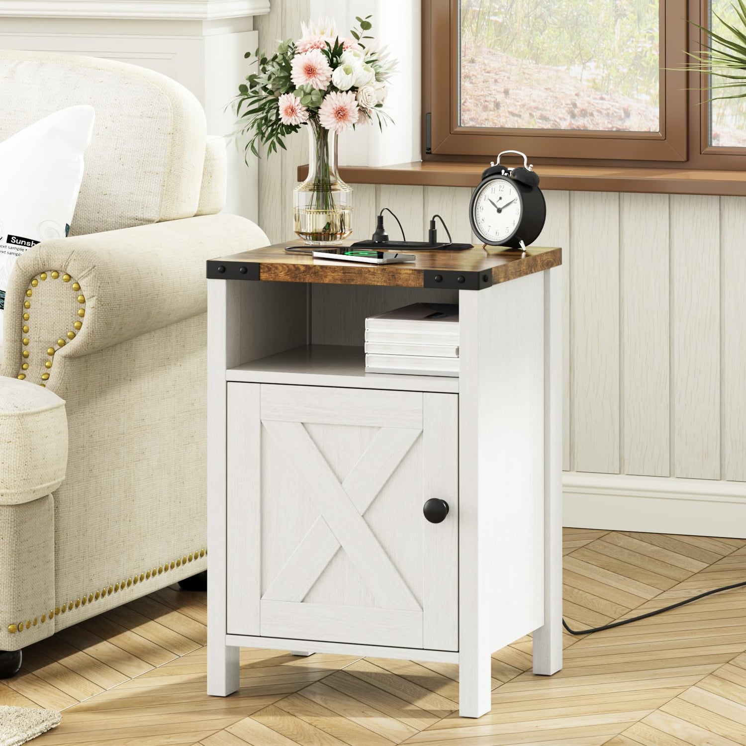- Barn Door and Shelf: A barn door adds to the charm of these end tables. Behind the door, there might be a compartment for storage, while an open shelf below provides additional space for books, magazines, or decorative items