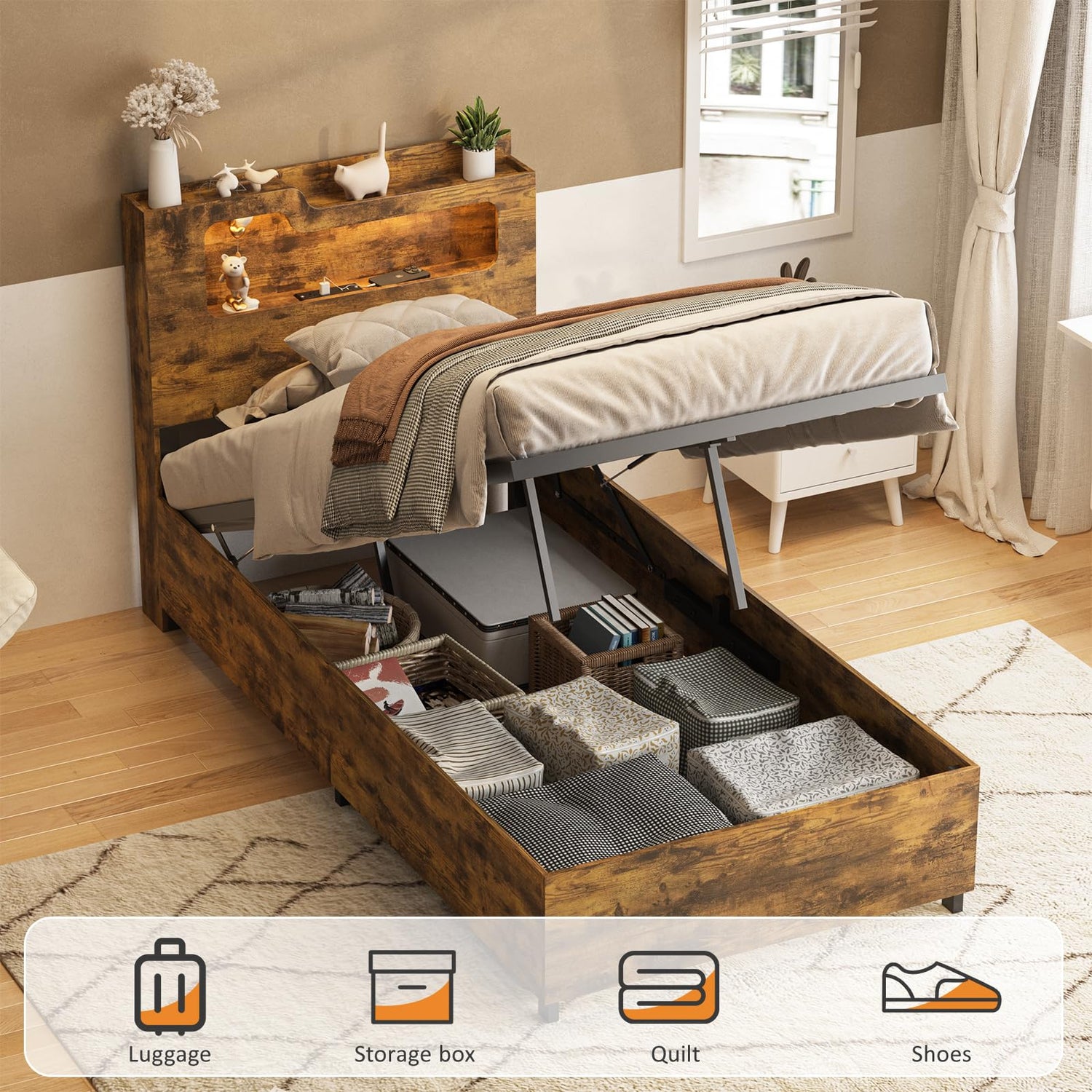 Fameill Twin Size Lift Up Storage Bed Frame, 2-Tier Headboard Wooden Platform Bed Frame with Lifting Storage & Charging Station, No Spring Box Needed/Noise Free