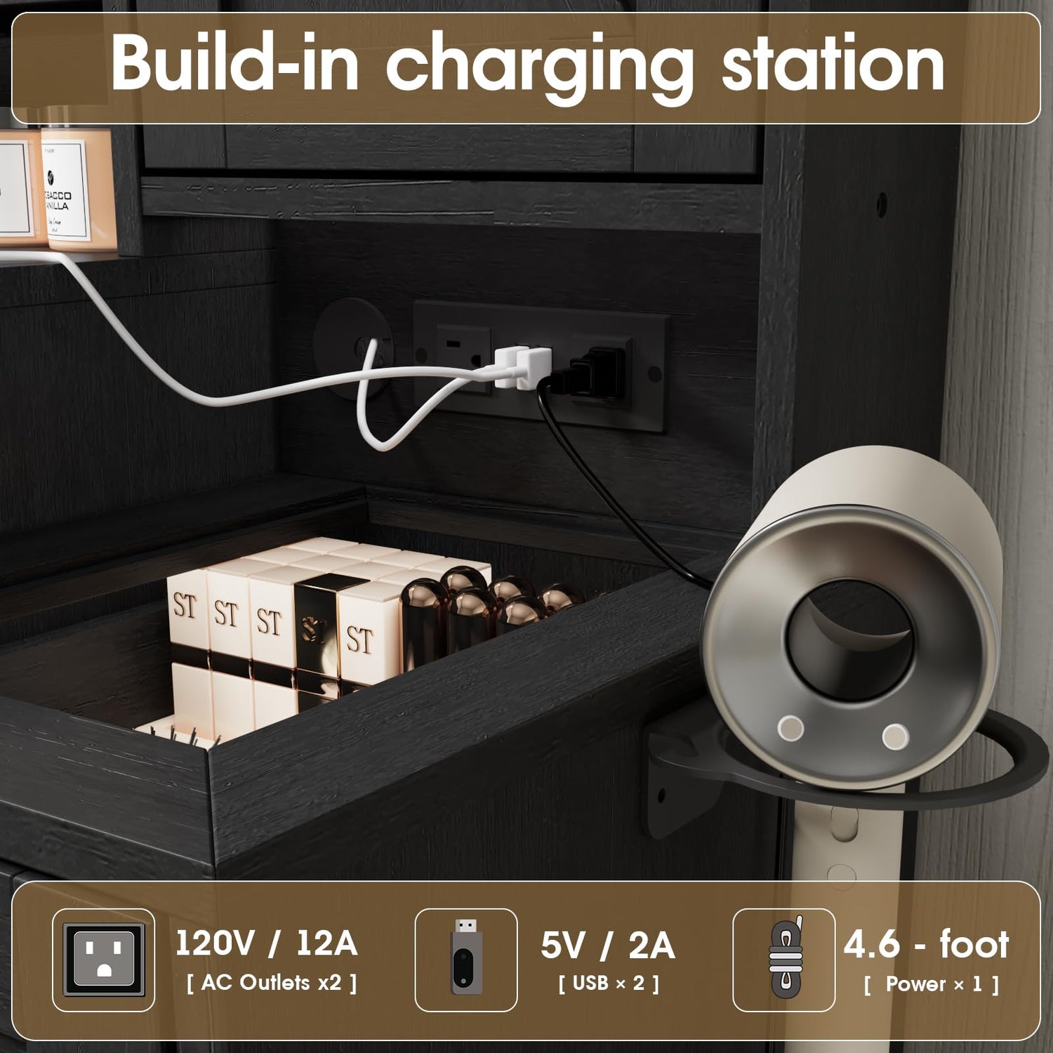 - Built-in Charging Station:Vanity with drawers equipped with a built-in charging station, you can conveniently charge your cell phone and other electronic devices. The side hair dryer holder can be used for your hair styling needs