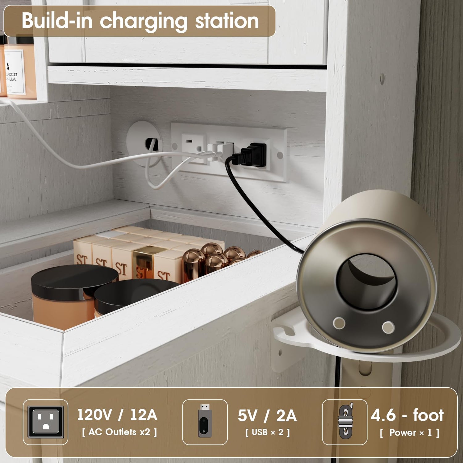 - Built-in Charging Station:Vanity with drawers equipped with a built-in charging station, you can conveniently charge your cell phone and other electronic devices . The side hair dryer holder can be used for your hair styling needs