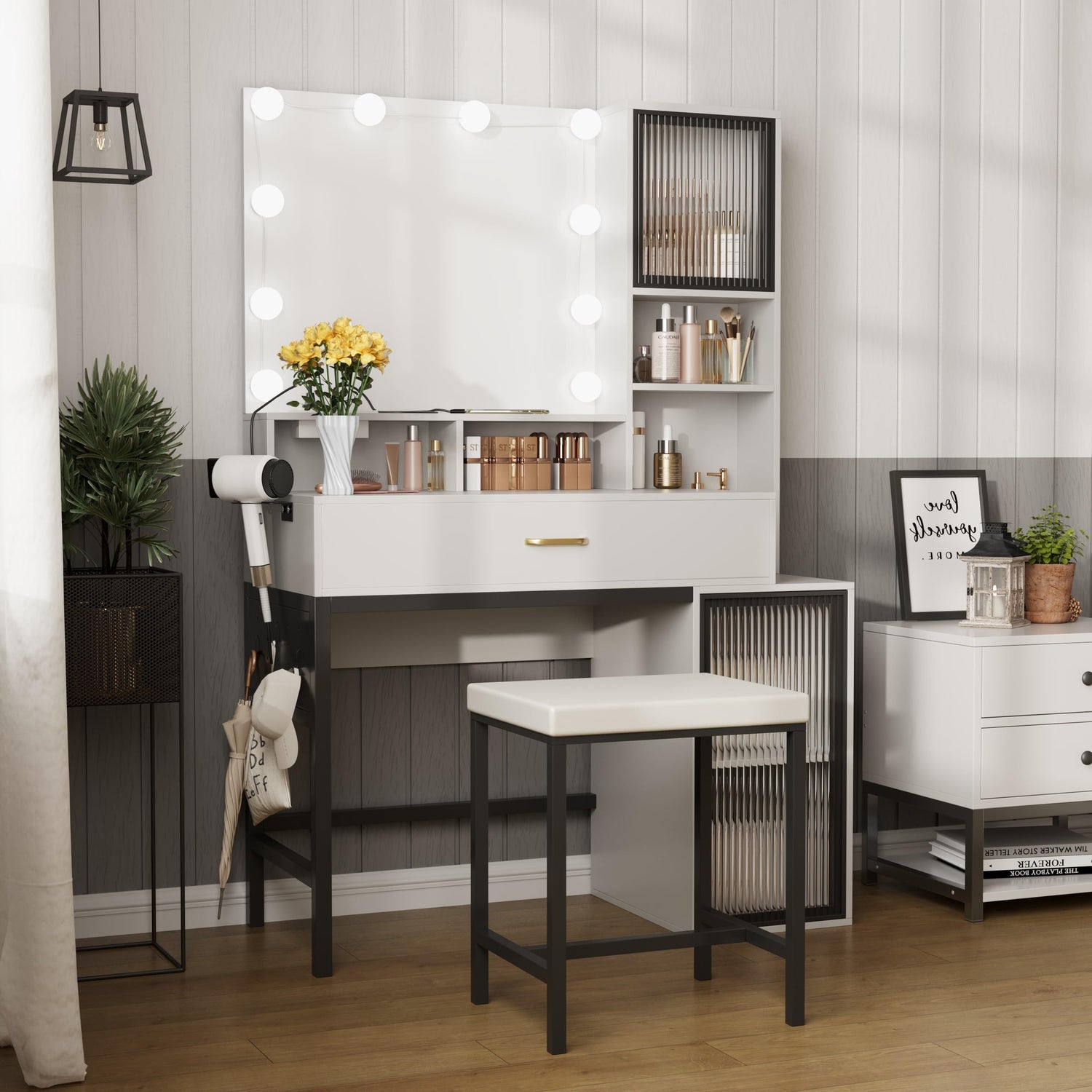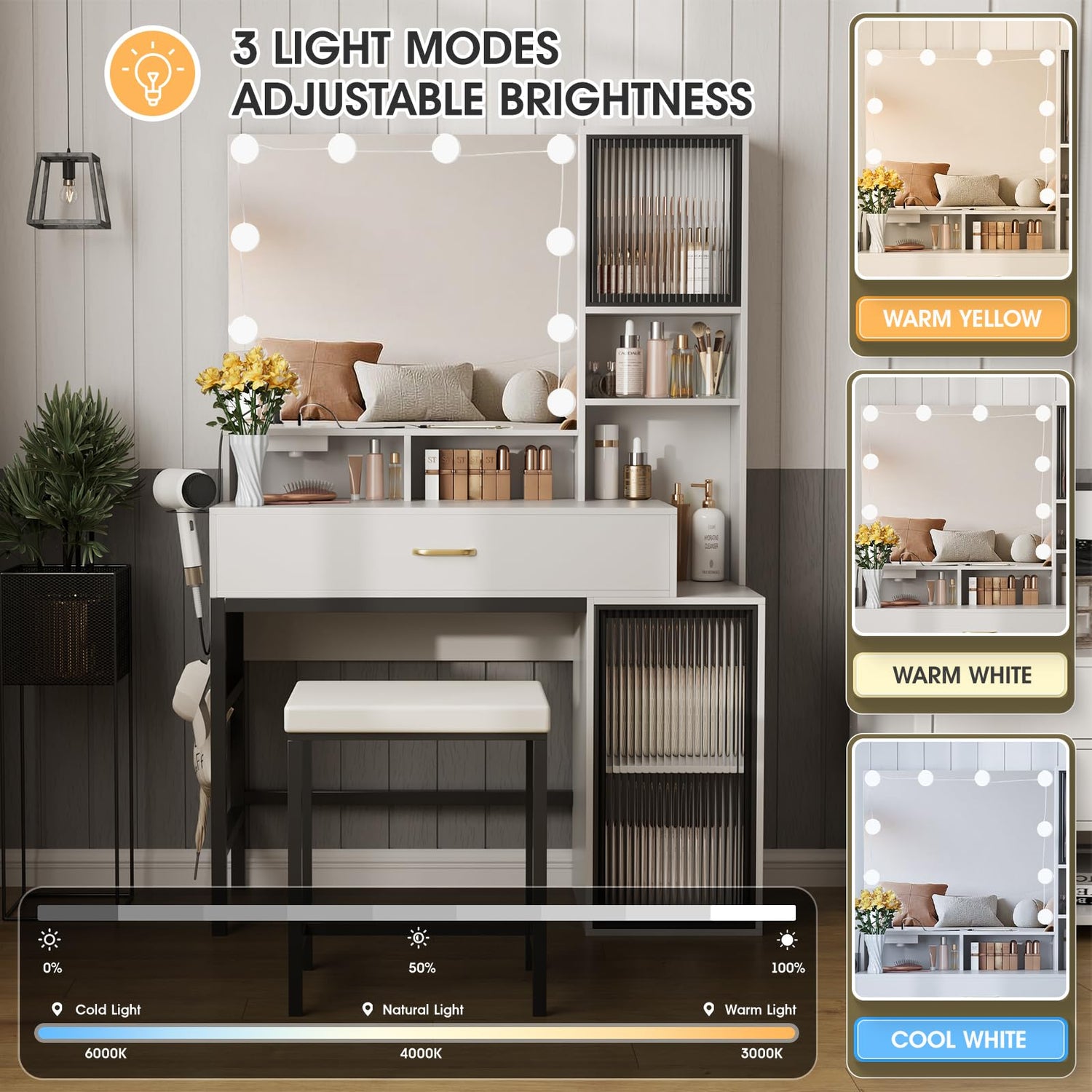 Fameill Vanity with Mirror and Light, Makeup Vanity Desk with 3 Color Lighting, White Vanity with Charging Station and Clothes Hook, Large Vanity Set with Lots Storage, Black Metal Frame