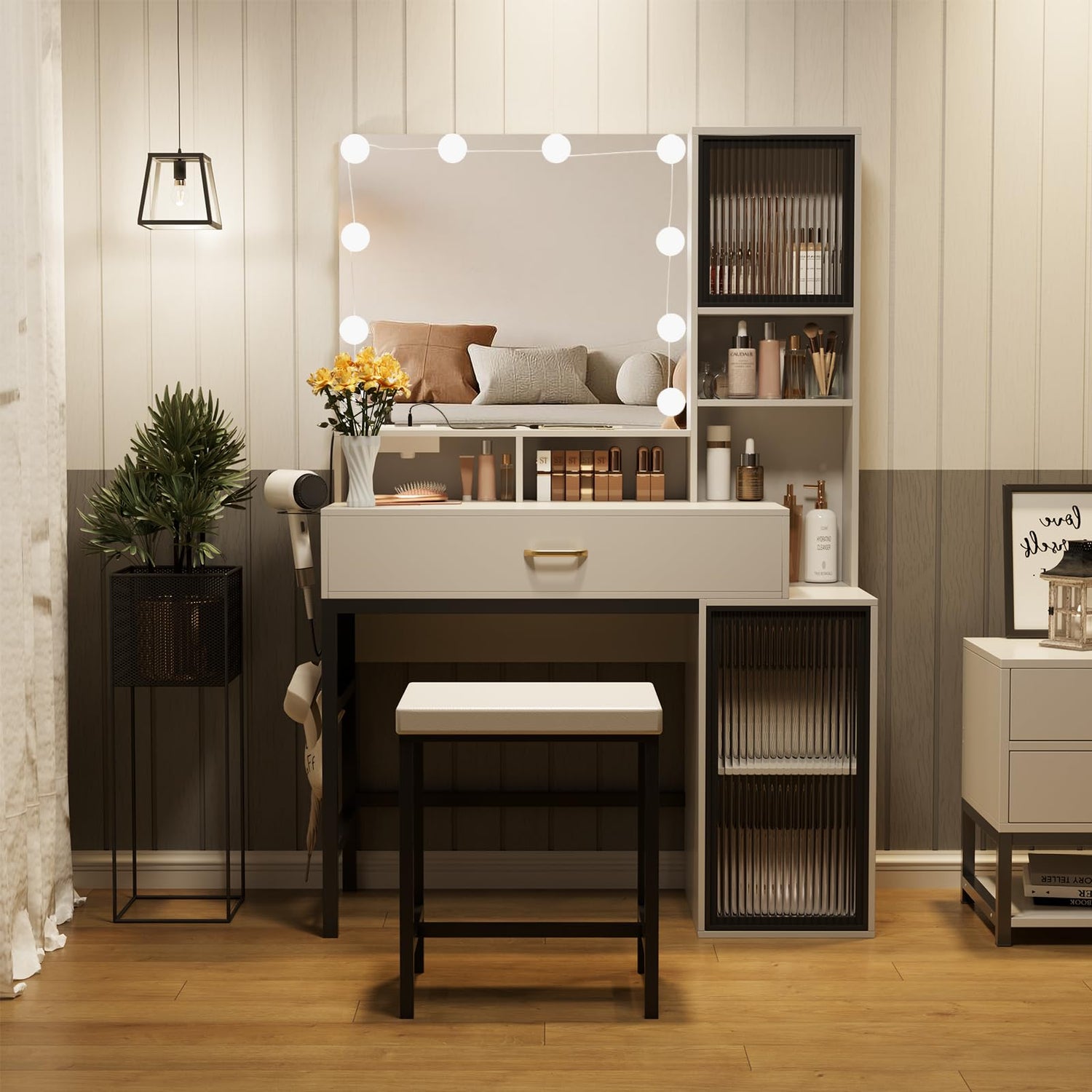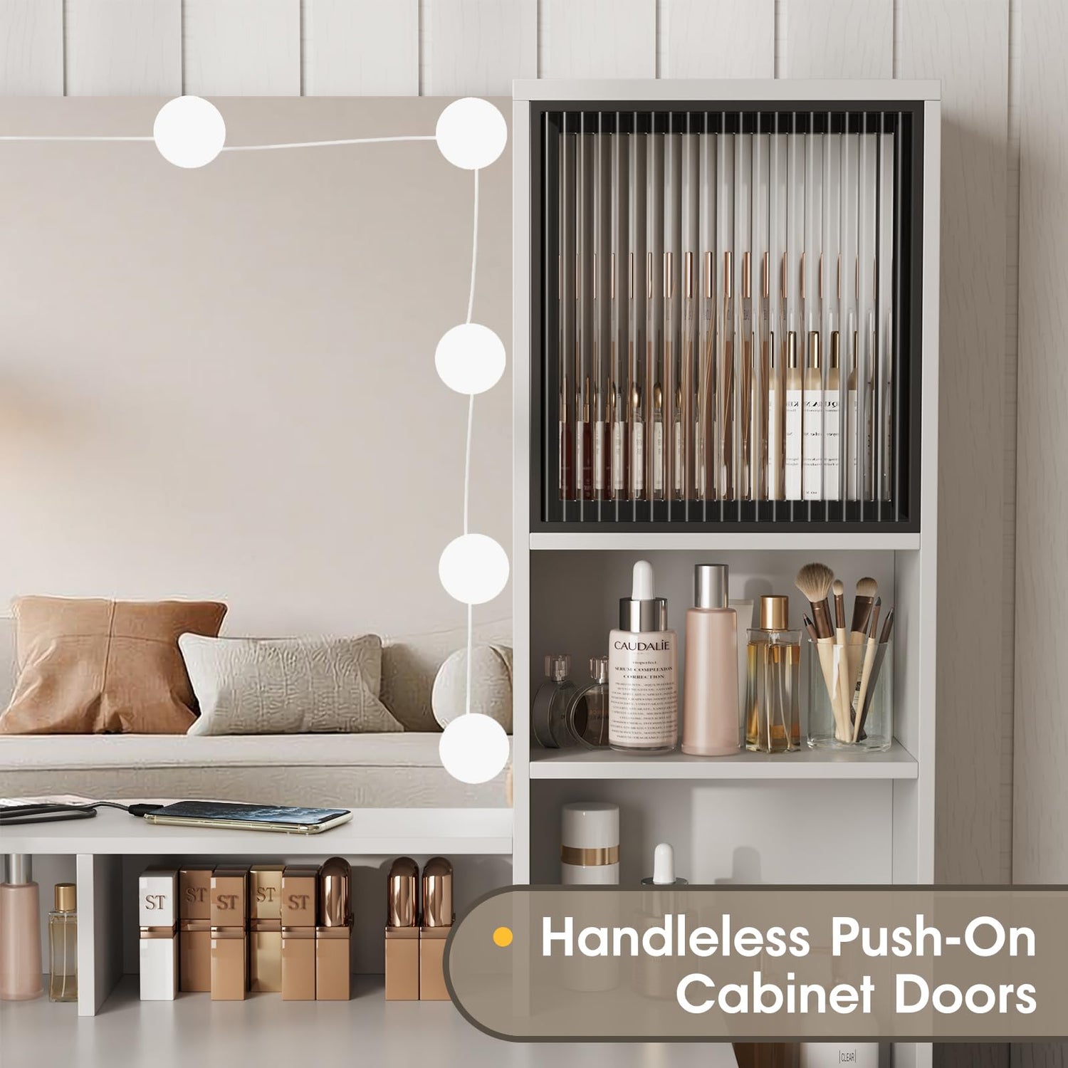 - Transparent acrylic cabinet door press design: press type cabinet door for makeup vanity desk does not come with a handle, press the door to open the cabinet, making the whole more beautiful and elegant.