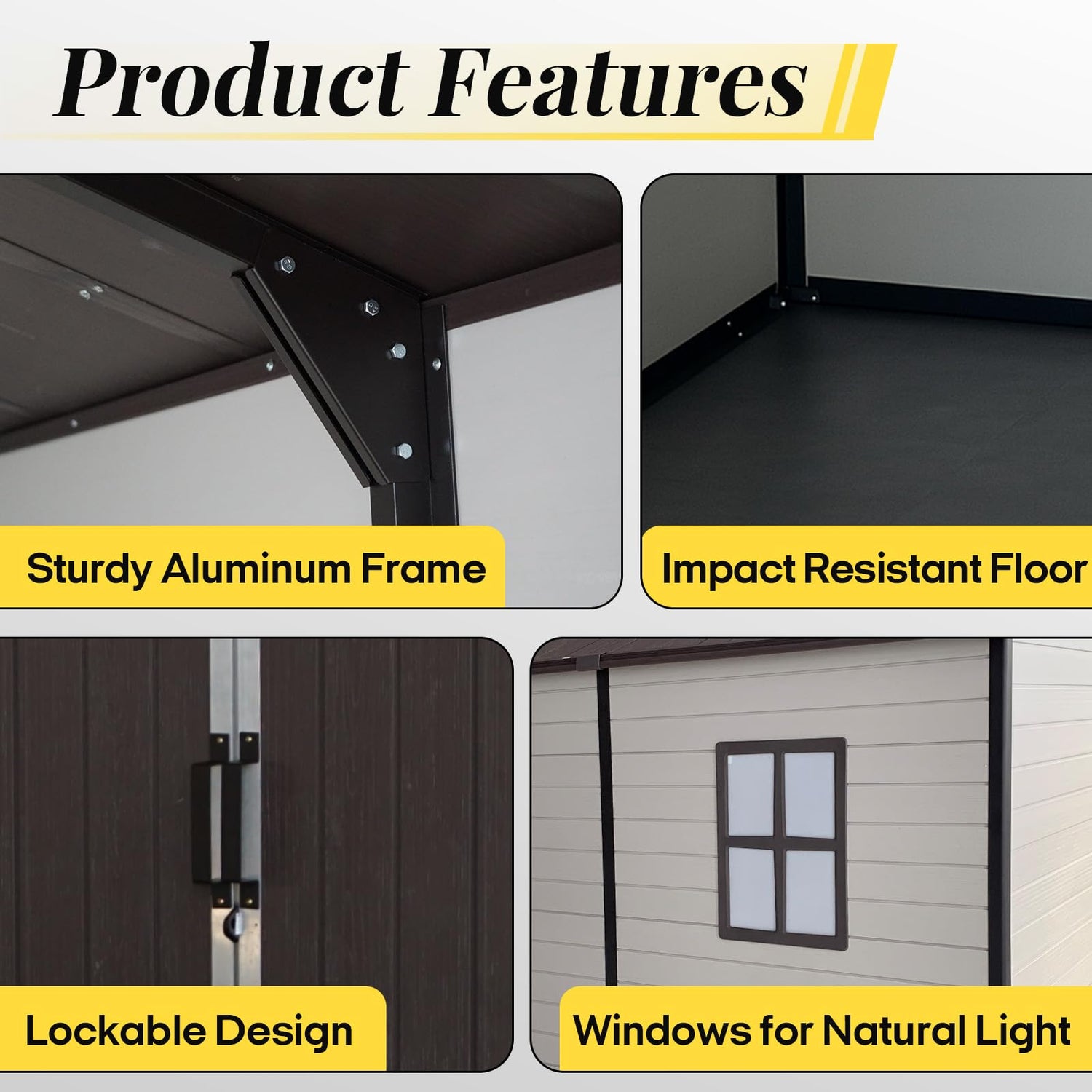 - Durable Construction: Crafted with high-quality resin walls and a rust-resistant aluminum frame, this resin shed withstands rain, snow, and UV exposure, providing long-lasting durability and minimal maintenance.