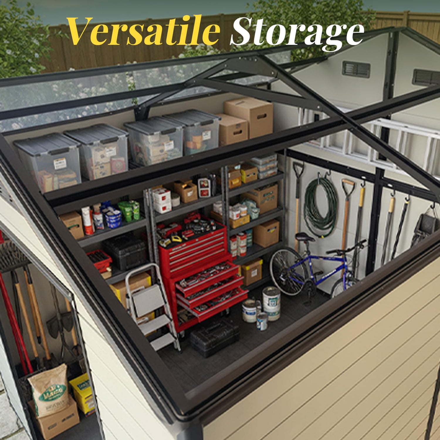 - Spacious Design: Standing 7.6 ft tall, this shed provides ample vertical room to easily store tall ladders, garden tools, or bulky equipment. Its generous interior makes this outdoor shed perfect for organizing your backyard essentials without crowding.