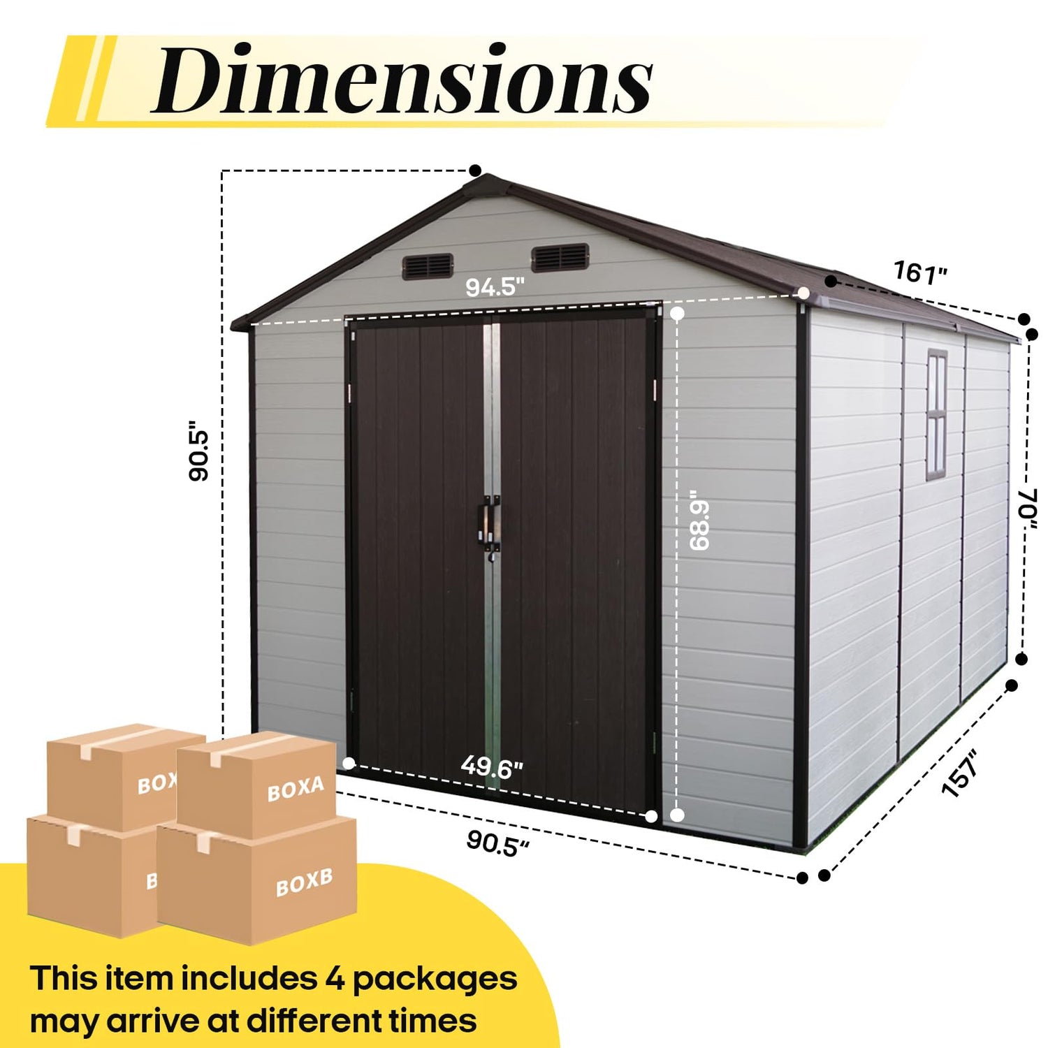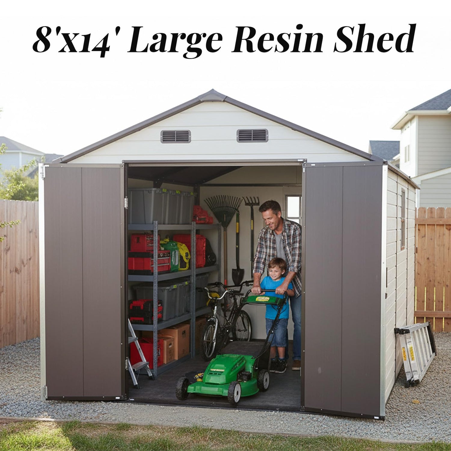 FammyLoft 8x14 FT Resin Storage Sheds Outdoor with Floor Included, Plastic Sheds & Outdoor Storage Clearance with 2 Windows and Lockable Door, Backyard Storage Sheds for Garden Tools, Brown+White
