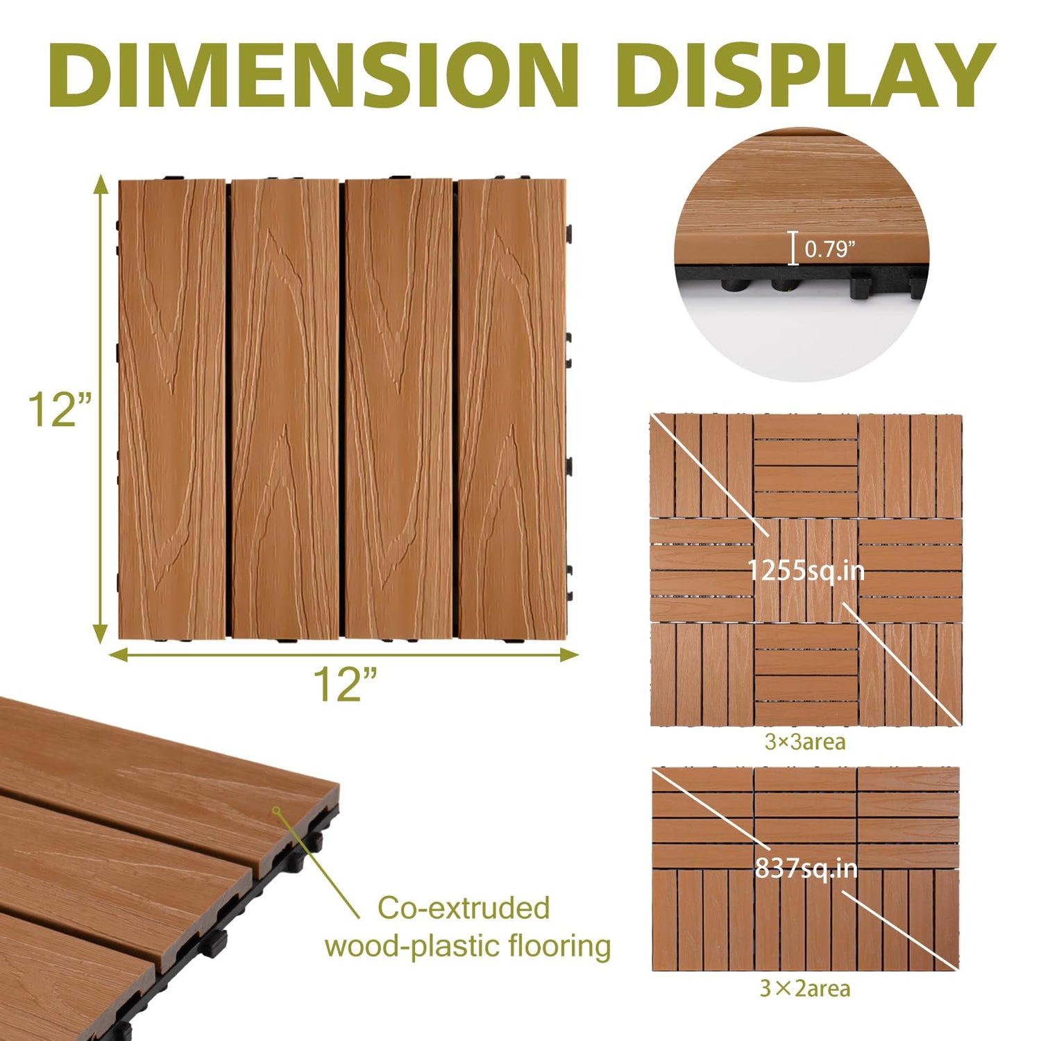 famobay Wood Plastic Composite Patio Deck Tiles,DIY Interlocking Decking Tiles, Floor Tile,Durable, Maintenance,Waterproof,Indoor Outdoor (6, 3D Teak, 12" x 12")