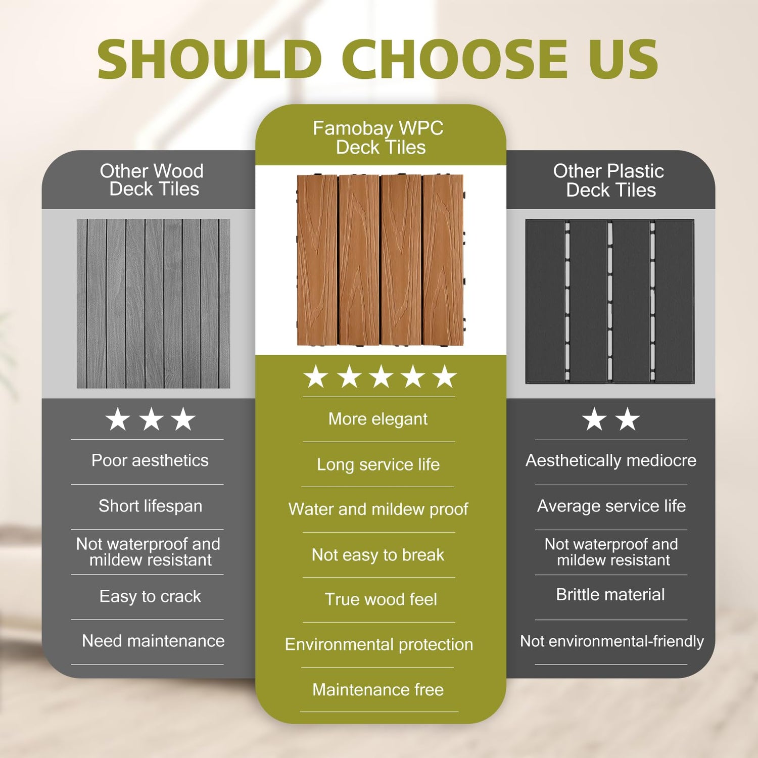 - 【Durable Premium Materials】- famobay tiles are made of hard WPC board,with features:Waterproof,Fire resistance,weather resistance etc.It will not rot,crack,warp,stain, scratch,split or bend as like traditional wood tiles, and lasts much longer.